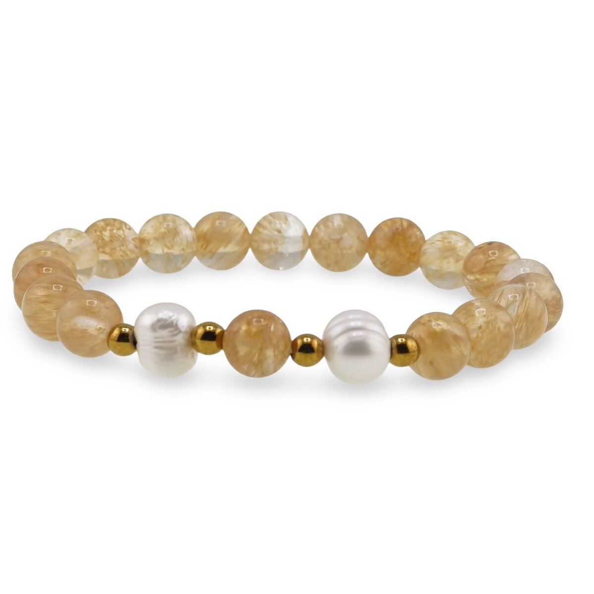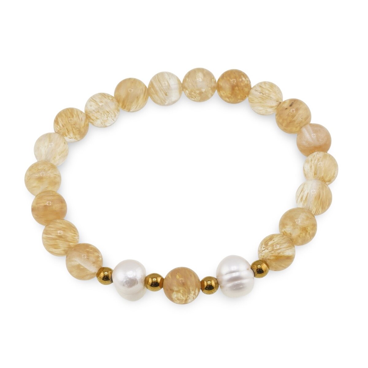 Cunoscut și ca cuart galben sau citrine, citrinul este adesea numit piatra succesului și este asociat cu energia prosperității și a abundenței financiare, susținând creativitatea, vitalitatea și protecția energetică. În această brățară este folosit citrin natural, tratat, pentru o culoare uniformă și plăcută. Perla de cultură, un carbonat de calciu organic (cultured pearl), aduce echilibru emoțional și o notă de blândețe, fiind apreciată pentru starea de relaxare pe care o inspiră.