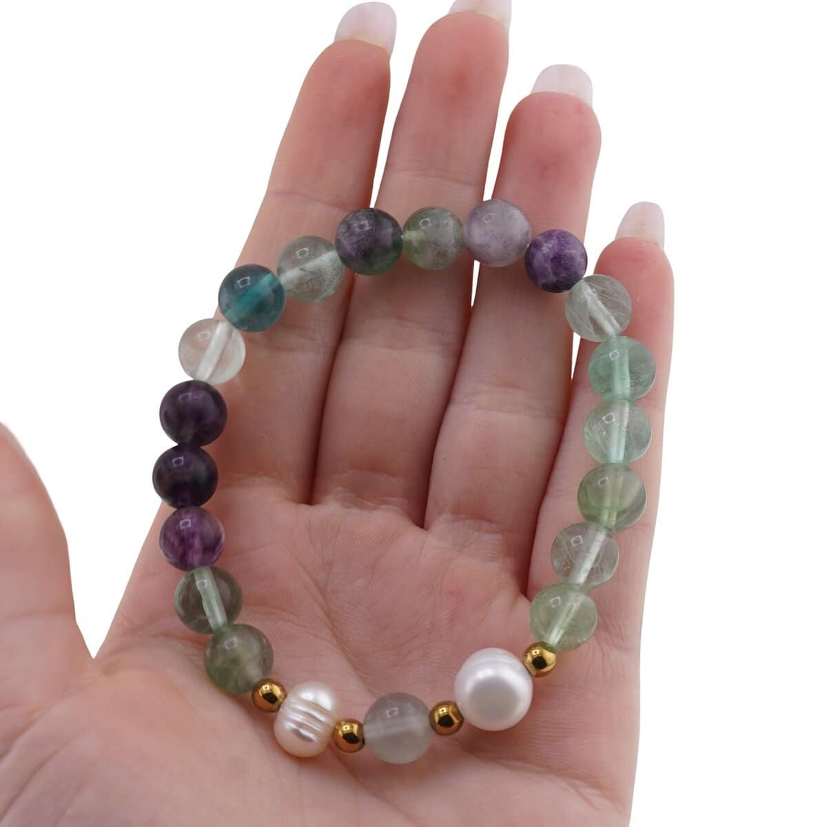 Delicată și ușor de purtat, această brățară pe elastic îmbină eleganța perlelor de cultură în tonuri albe cu accente calde de auriu și energia jucăușă a fluoritului în nuanțe de mov și verde. Realizată din cristale naturale 100%, cu sfere de 8 mm, devine un accesoriu plăcut pentru fiecare zi, aducând un strop de calm, claritate și echilibru emoțional în ținutele tale.