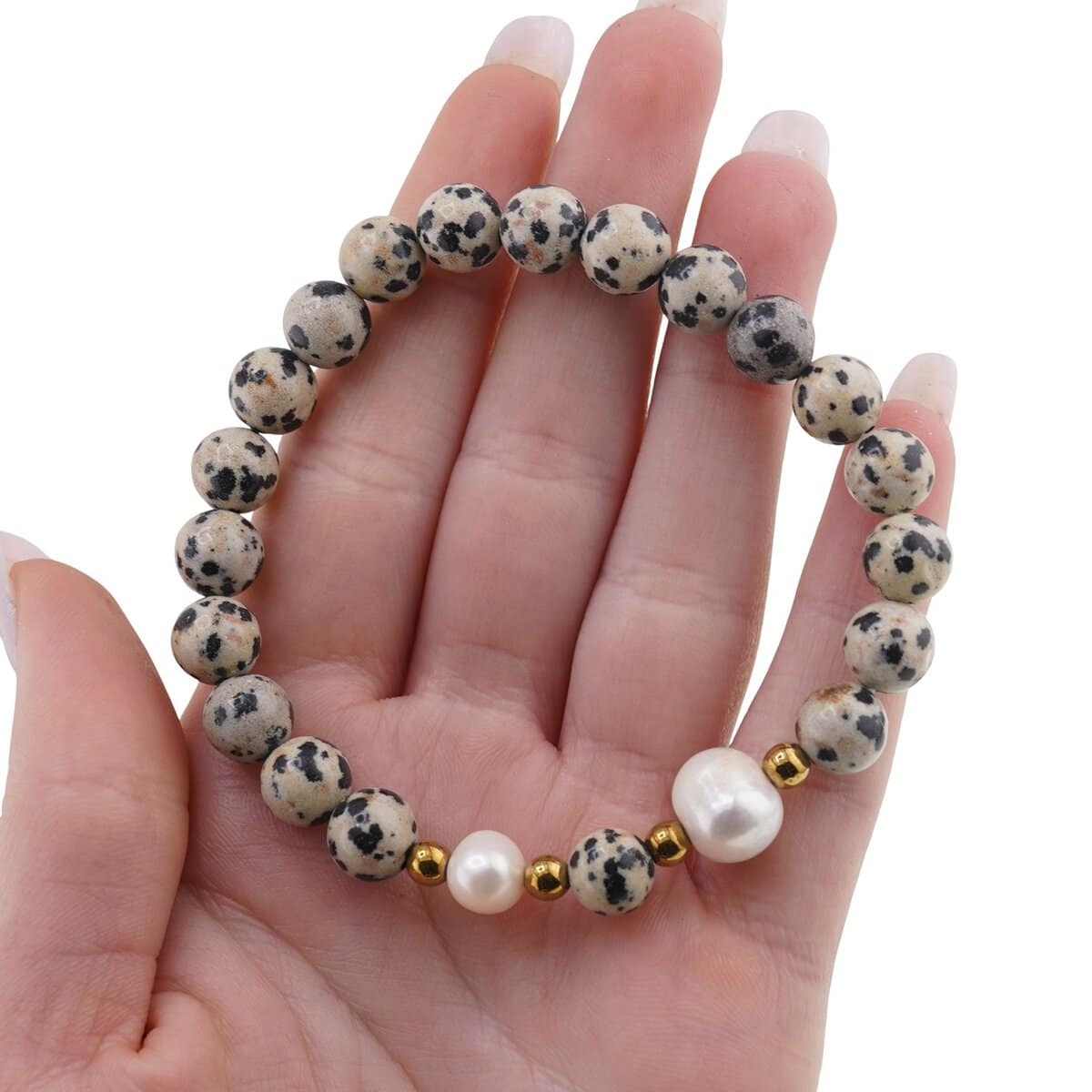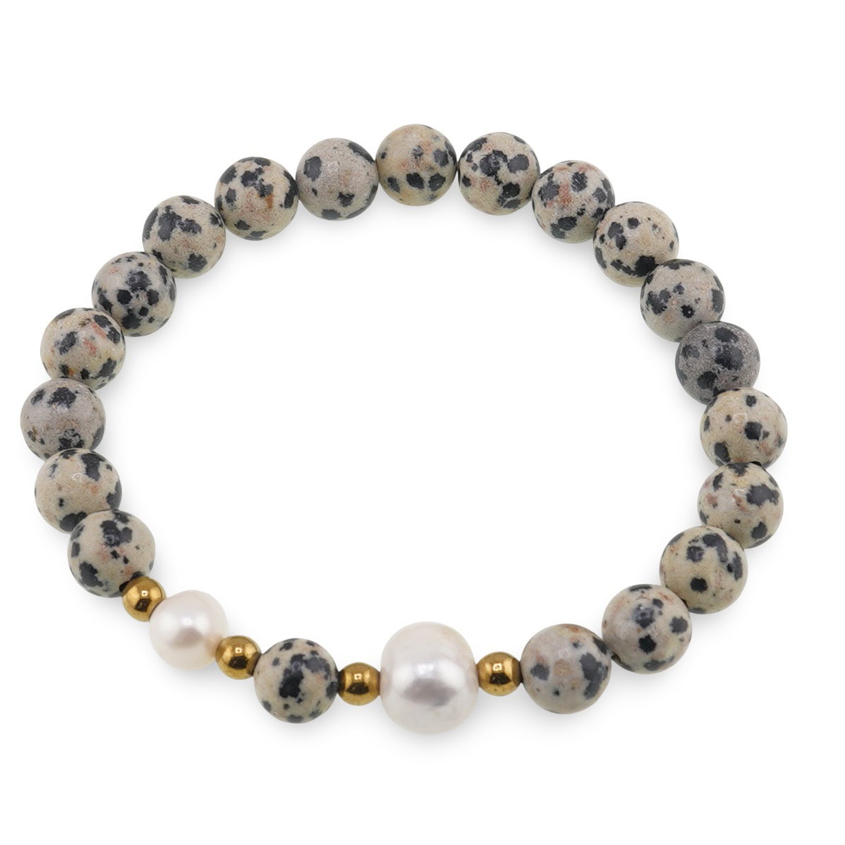 Cu un echilibru plăcut între eleganță și naturalețe, această brățară îmbină perle de cultură cu luciu sidefat, bumbi aurii și Jasp dalmatian în sfere de 8 mm. Tonurile de alb, auriu și maro se completează firesc, oferind un accesoriu versatil, ușor de purtat zi de zi. Construcția pe elastic asigură confort și potrivire rapidă, iar materialele sunt selectate din cristale naturale pentru un aspect autentic.