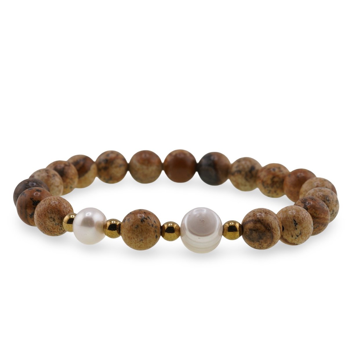 Bratara pe elastic Perle de cultura, bumbi aurii si Jasp peisaj sfere 8mm
