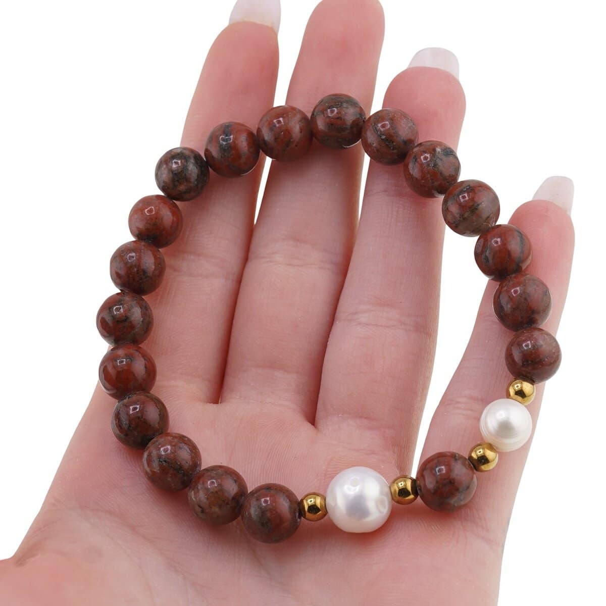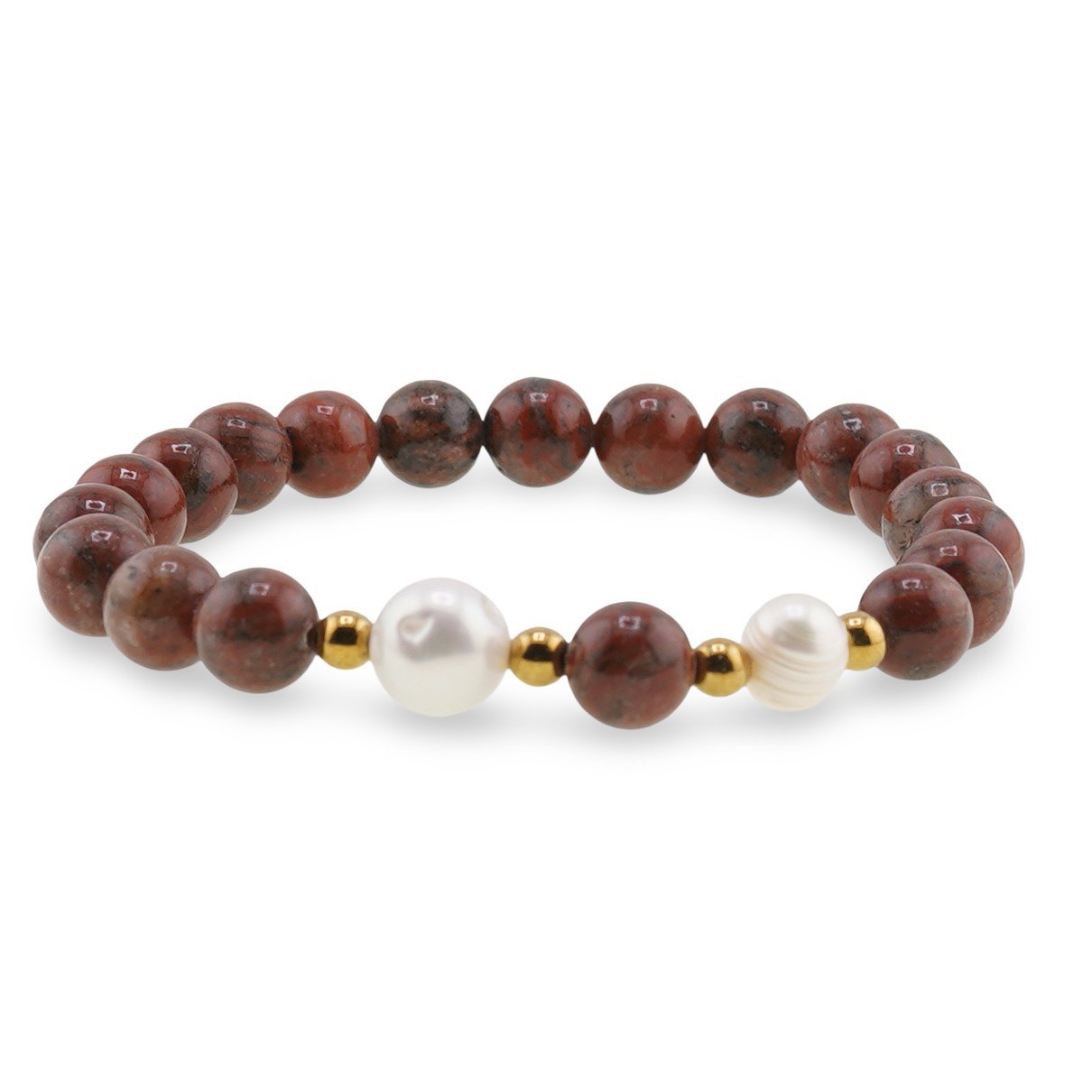 Această brățară elastică îmbină lumina caldă a perlelor de cultură cu energia pământului din Jaspul rainbow, într-o paletă prietenoasă de alb, auriu și roșu. Bumbi aurii accentuează discret contrastul dintre strălucirea perlelor și textura naturală a pietrelor, oferind o bijuterie echilibrată, ușor de purtat zi de zi.