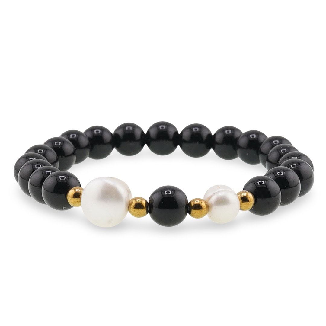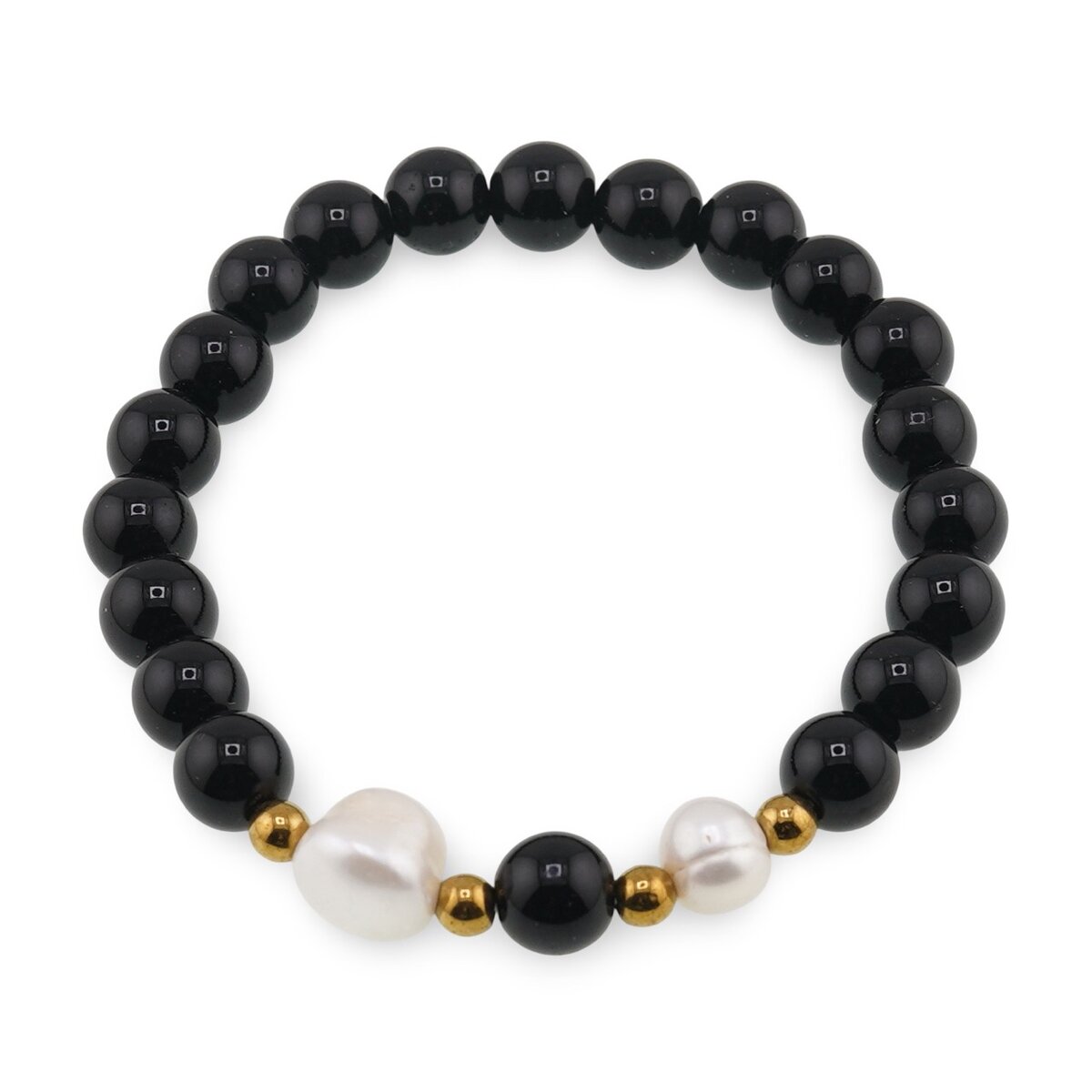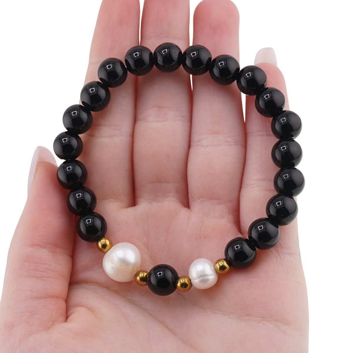 Onixul, o varietate de calcedonie stratificată (cunoscut ca Onyx), este apreciat pentru susținerea stărilor de împământare și stabilitate, pentru protecție energetică, curaj și voință. Perlele de cultură (carbonat de calciu organic, cultured pearl) aduc calm și relaxare, vindecare emoțională și echilibru emoțional și spiritual. Împreună, creează o brățară armonioasă, ce poate sprijini atât Chakra Rădăcinii – Muladhara, cât și Chakra Inimii – Anahata, sub influența Lunii și a lui Saturn și în legătură cu elementele Apă și Pământ.