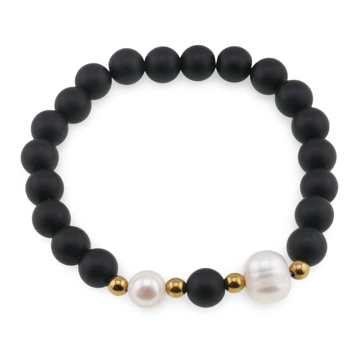 Bratara pe elastic Perle de cultura, bumbi aurii si Onix sfere mate 8mm