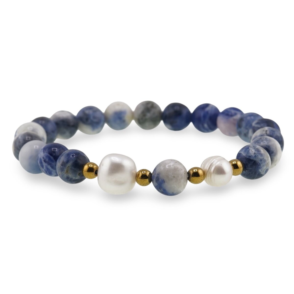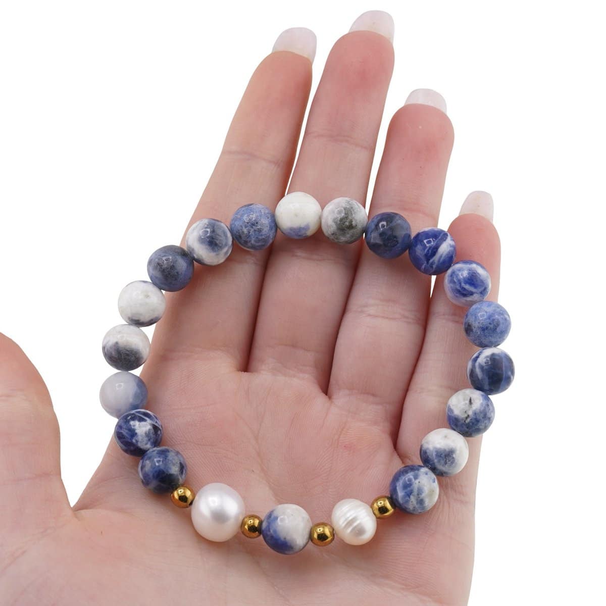 O brățară delicată și echilibrată, creată pentru tine din cristale naturale autentice. Combinația dintre perlele de cultură în tonuri albe, Sodalitul deschis în sfere de 8 mm și bumbi aurii oferă o apariție rafinată, cu accente calde de auriu și nuanțe liniștitoare de albastru. Perlele (cunoscut și ca Cultured Pearl, carbonat de calciu organic) aduc o strălucire subtilă, iar Sodalitul, întâlnit și sub denumirea Sodalite sau “piatra logicii” (silicat de aluminiu și sodiu), imprimă o notă clară și calmă.