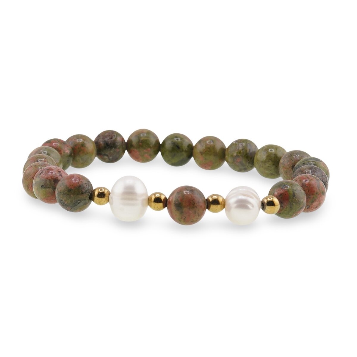 Această brățară îmbină eleganța perlelor de cultură cu energia calmă a Unakitului, într-o piesă ușor de purtat zi de zi. Sferelor de 8 mm li se alătură bumbi aurii discreți, iar paleta alb–auriu–verde creează un contrast plăcut, potrivit atât pentru ținute casual, cât și pentru momente speciale. Perlele (cunoscute și ca Cultured Pearl, formate din carbonat de calciu organic) aduc o notă clasică, în timp ce Unakitul, un amestec natural de epidot cu feldspat și cuarț, este apreciat pentru susținerea vindecării emoționale.