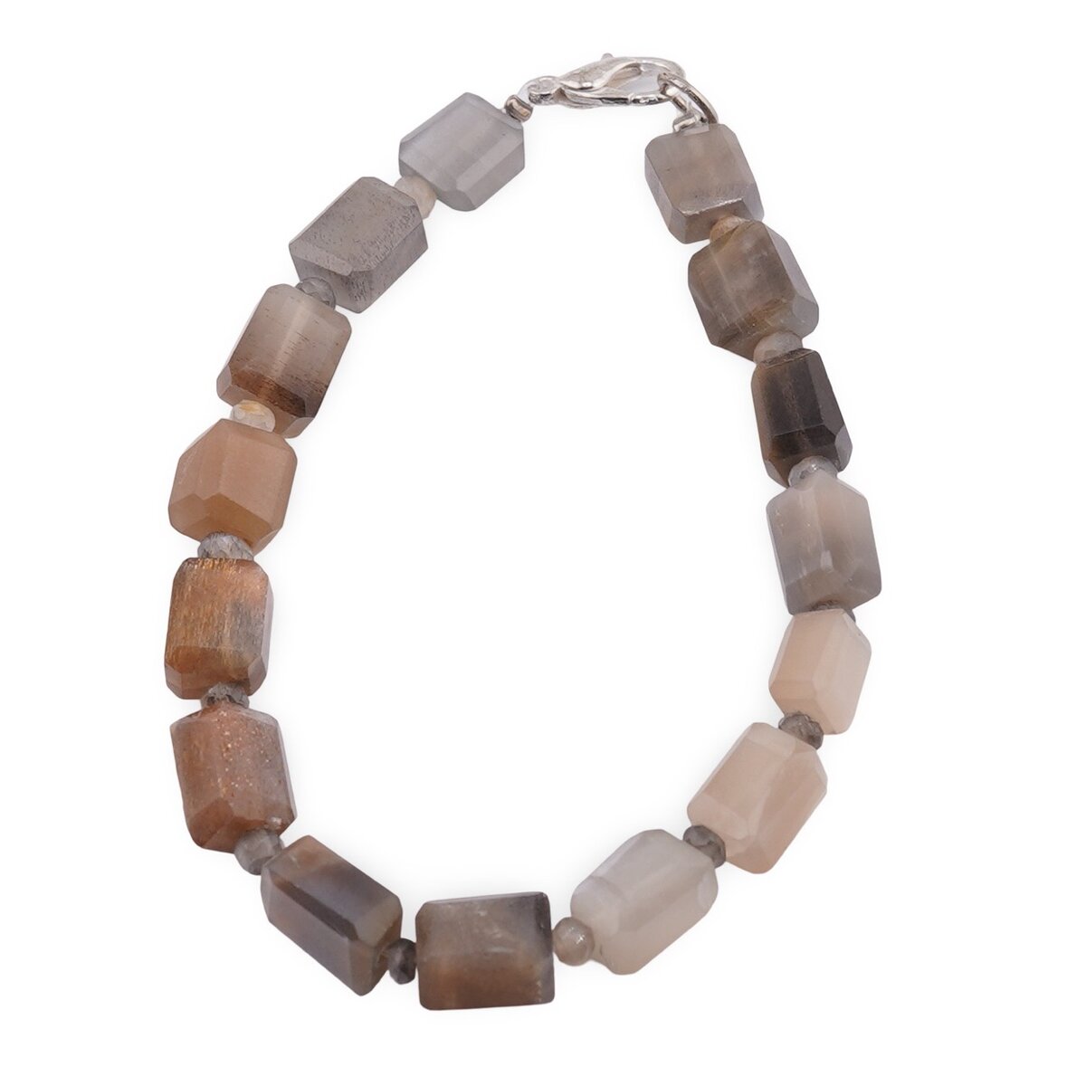 Această brățară din cristal natural 100% îmbină frumusețea discretă a Pietrei Lunii gri cu texturi fațetate care prind lumina într-un mod plăcut. Tonurile neutre de gri și maro se așază armonios pe încheietură, iar alternanța dintre discurile delicate și elementele dreptunghiulare evidențiază luciul catifelat specific acestui feldspat ortoclazic, cunoscut și ca Moonstone sau „piatra intuiției”. Piesa este completată de elemente metalice din metal comun sau argint 925, în funcție de variantă, pentru un aspect echilibrat și versatil.