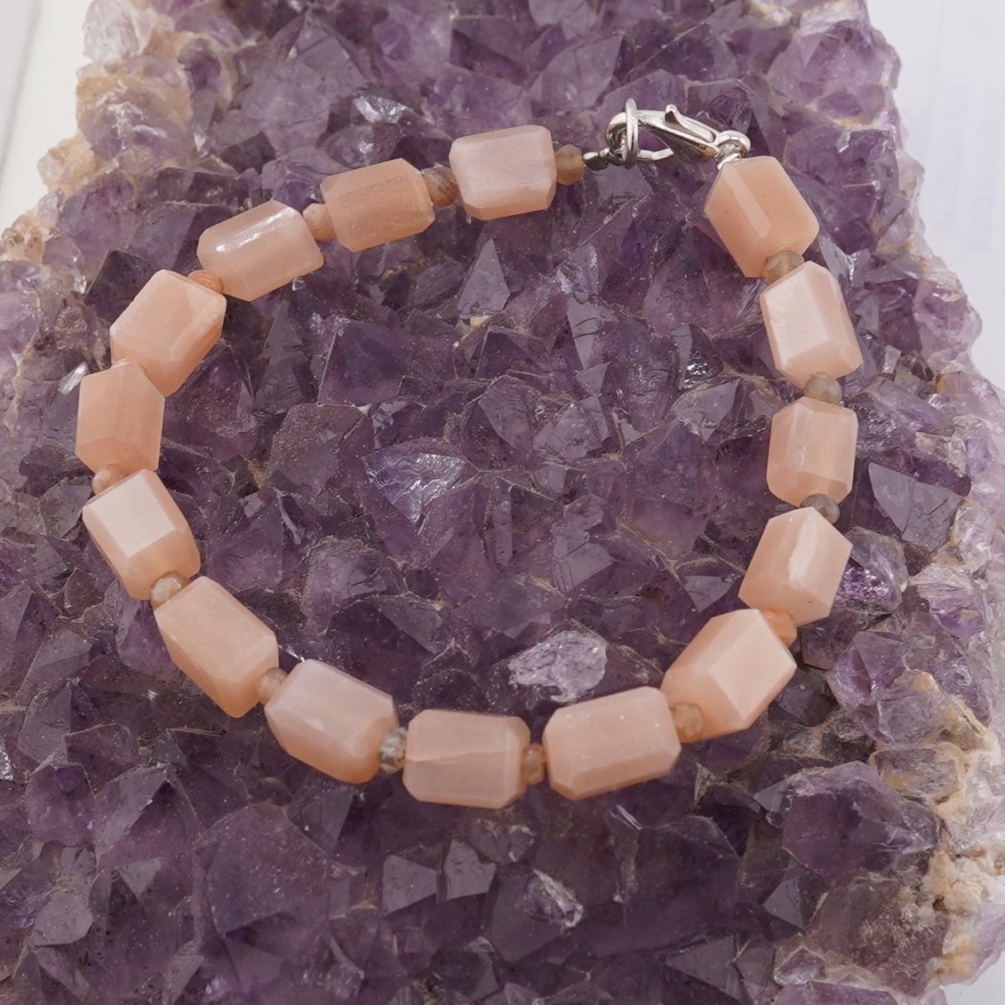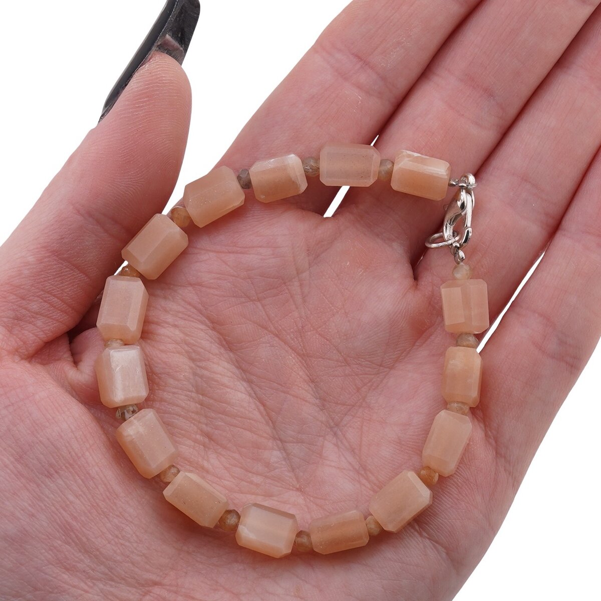 Designul îmbină elegant discuri fațetate de aproximativ 4 mm cu elemente fațetate de 8–10 mm, de formă dreptunghiulară, astfel încât lumina să danseze pe fiecare muchie. Accentele metalice sunt realizate din metal comun sau argint 925, completând armonios nuanța piersică a cristalelor. Cu o duritate de 6–6,5 pe scara Mohs, piesa este gândită pentru purtare zilnică, păstrând în același timp finețea materialului natural.