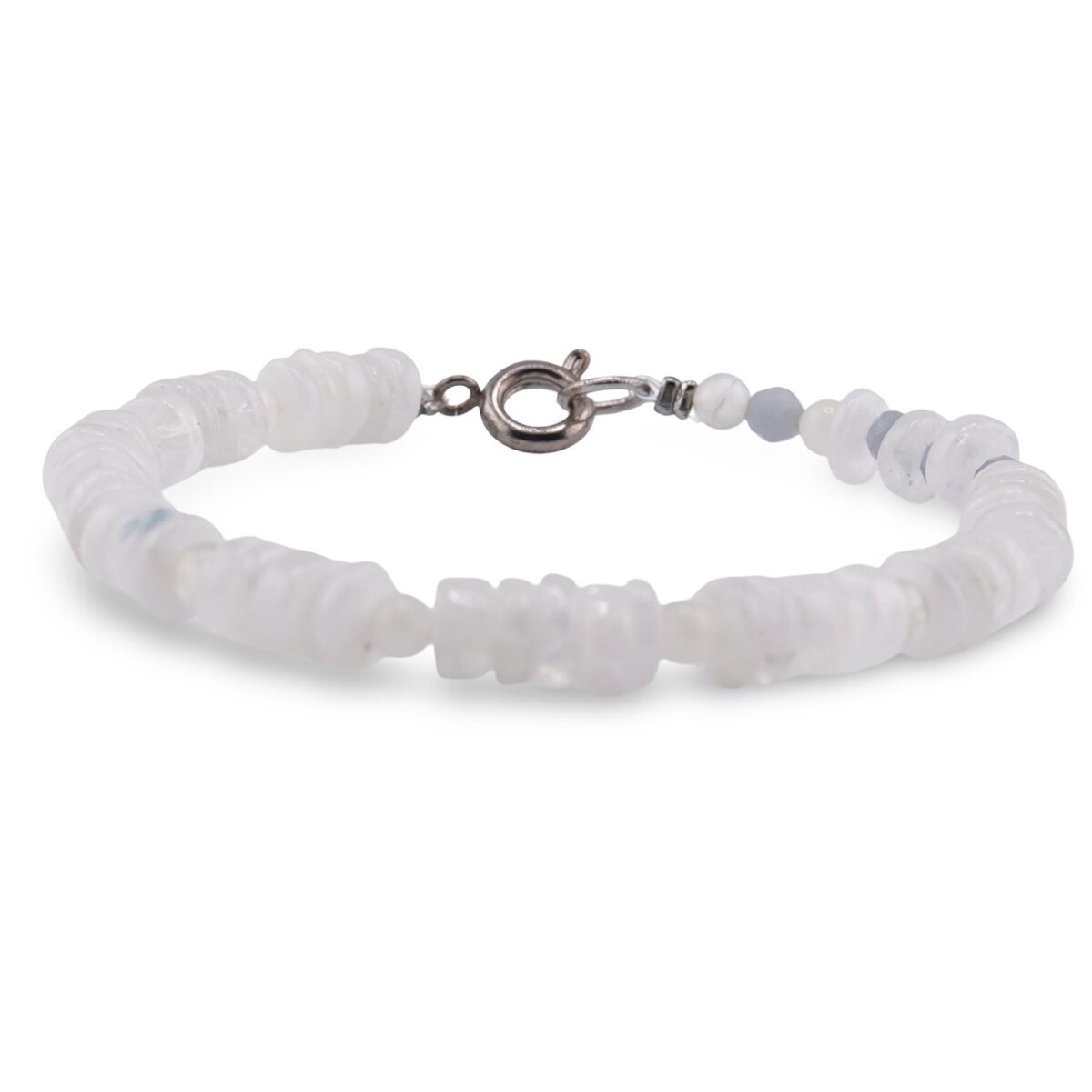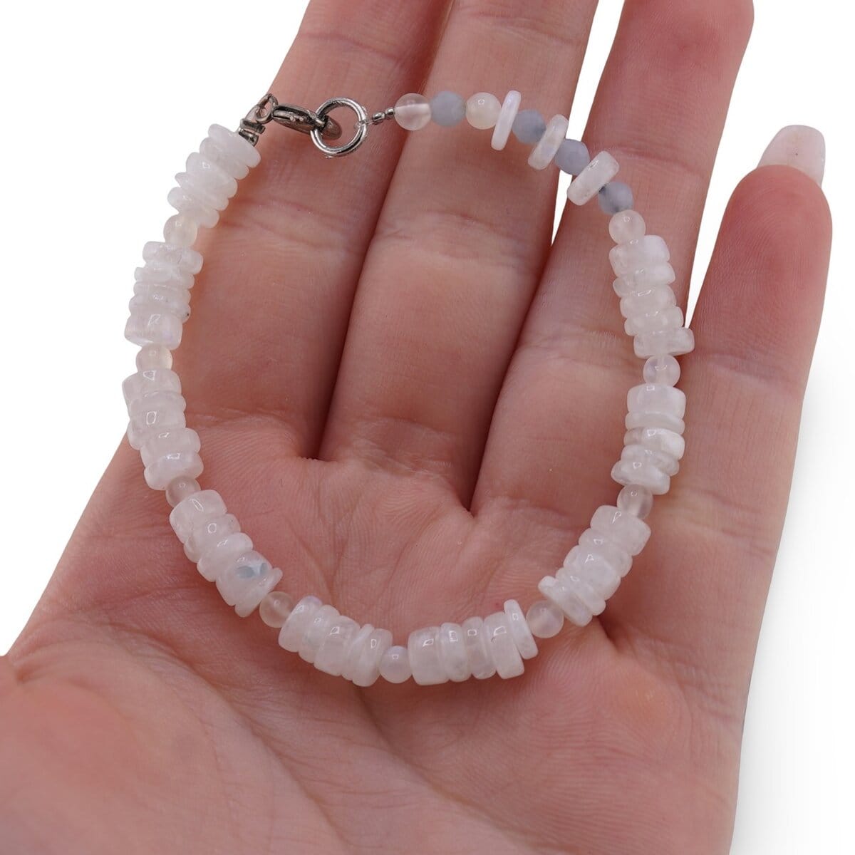 Creată pentru momentele în care vrei să-ți regăsești liniștea interioară, această brățară din cristale naturale 100% îmbină albul lăptos al Pietrei Lunii (Feldspat ortoclazic, Moonstone) cu albastrul clar al Acvamarinului (Aquamarine, beril albastru). Designul cu sfere și discuri fine, completat de accente fațetate, oferă o prezență plăcută la încheietură, fără să fie încărcat, ușor de purtat zi de zi.