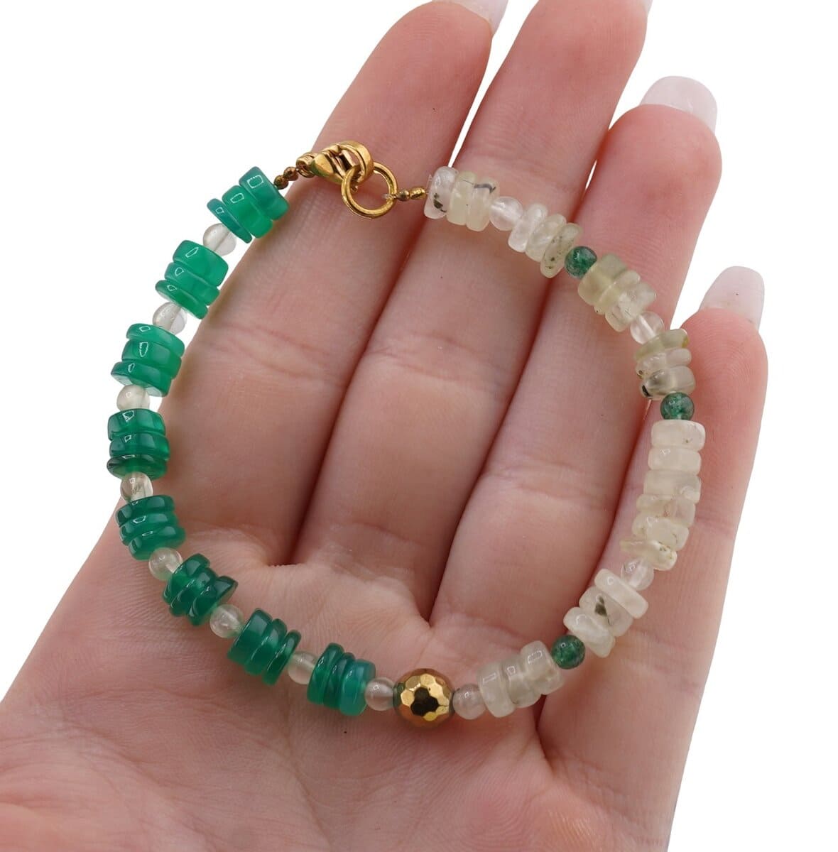 O brățară cu tonuri de verde și accente aurii, construită din cristale naturale 100%, în care discurile de onix verde de 5–6 mm se împletesc cu sfere fine de aventurin și prehnit de 3 mm, iar centrul este pus în valoare de o sferă fațetată de hematit auriu de 6 mm. Textura alternată de discuri, sfere netede și sfera fațetată creează un ritm plăcut, discret și ușor de asortat. Hematitul auriu are o nuanță obținută prin tratament, păstrând în același timp naturalețea mineralului.