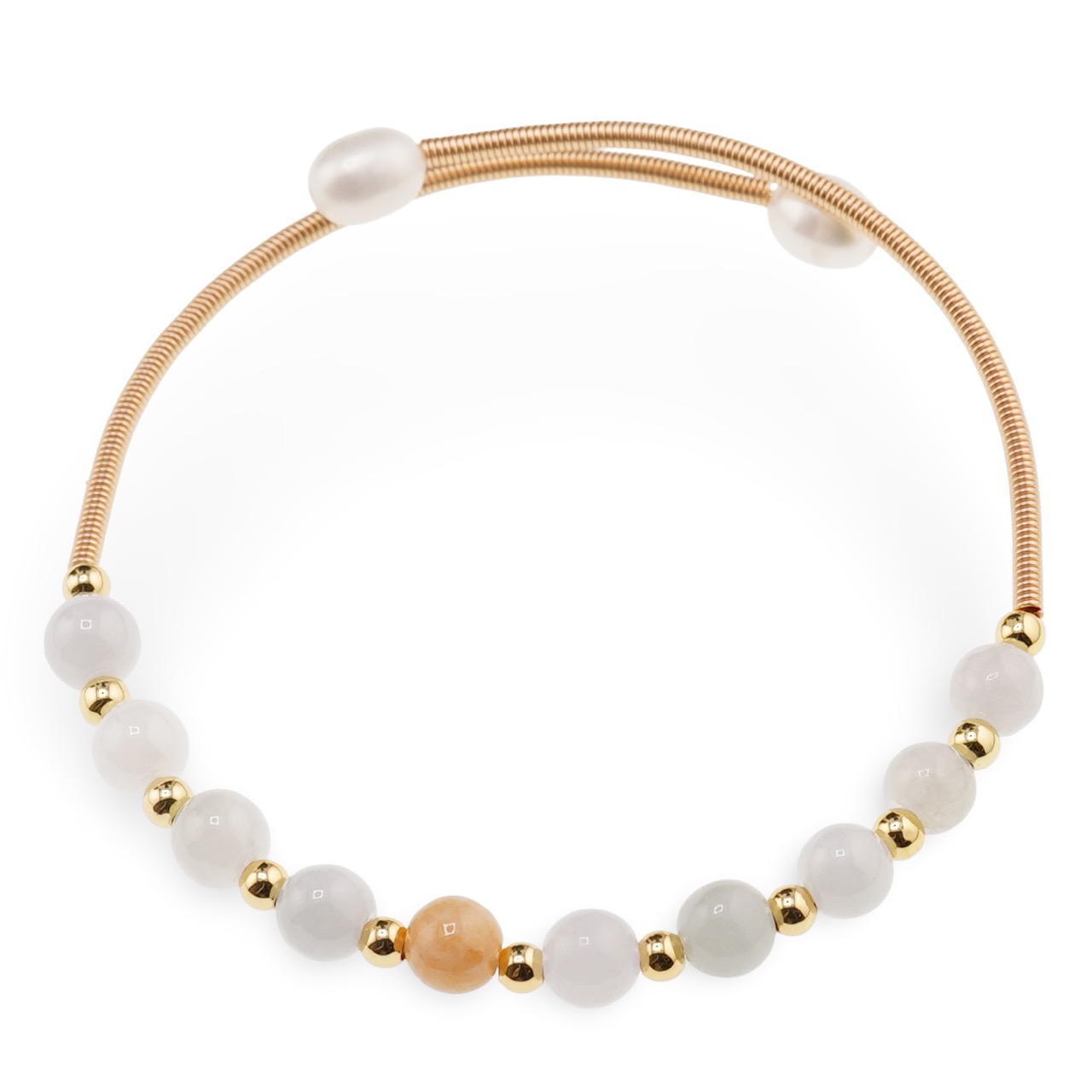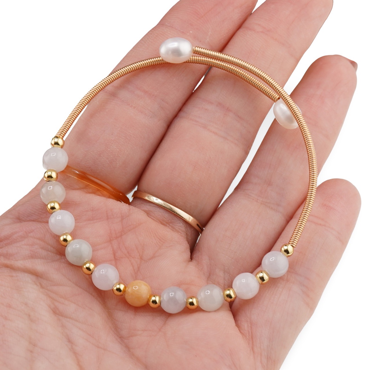 Această brățară reglabilă fără închidere îmbină delicat nuanțele de alb, albastru și accente aurii într-o piesă ușor de purtat zi de zi. Realizată din acvamarin natural și perle de cultură, în formă de sfere fine, brățara are un aspect luminos și echilibrat, potrivit atât pentru ținute simple, cât și pentru combinații mai elegante. Fiind flexibilă, se ajustează ușor pe dimensiunea încheieturii, ceea ce o face comodă și practică pentru purtare frecventă.
