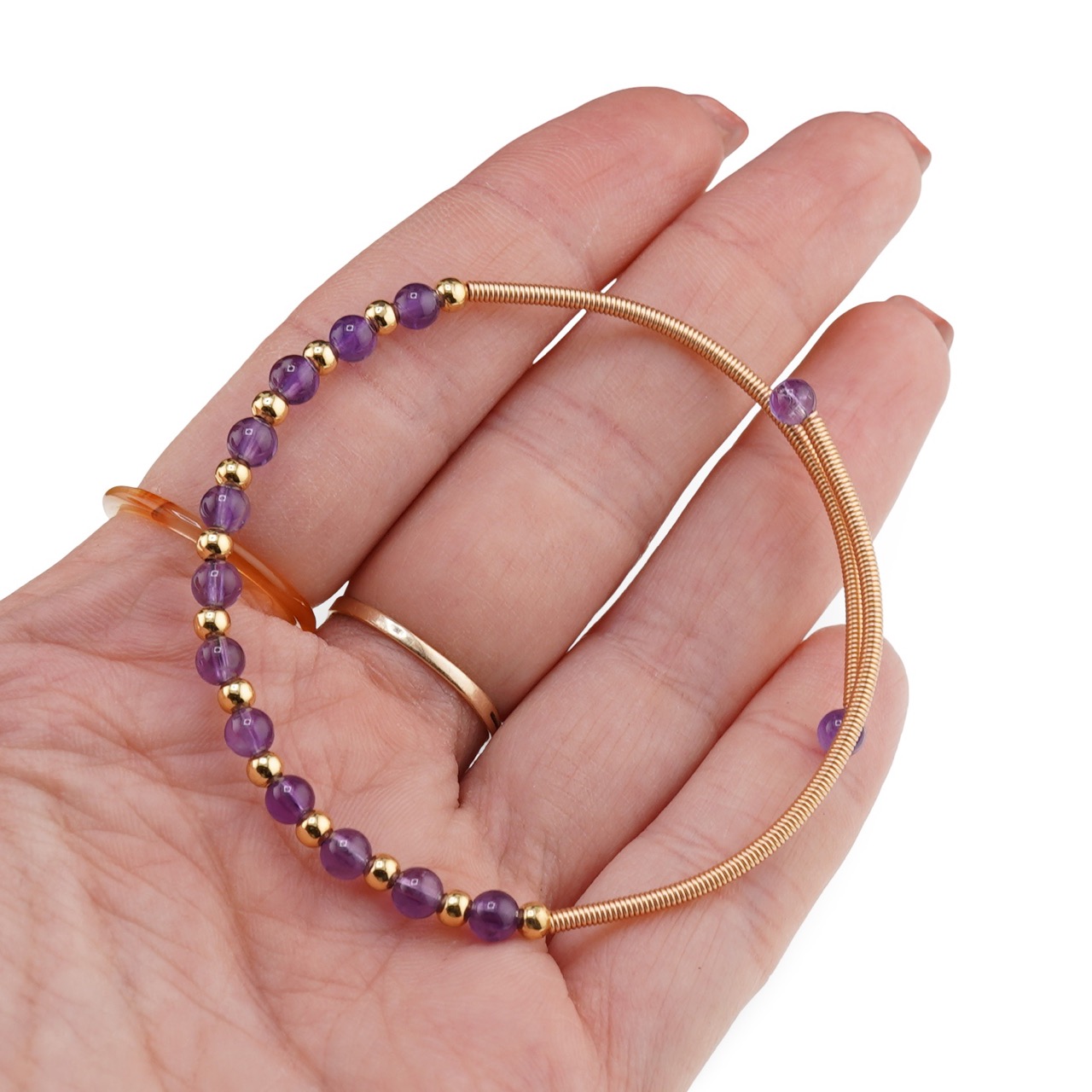 Această brățară reglabilă fără închidere cu Ametist este o alegere potrivită pentru cei care își doresc un accesoriu discret, ușor de purtat și plăcut de integrat în ținutele de zi cu zi. Realizată din cristal natural 100%, cu sfere de 4 mm în nuanțe mov, completate de detalii metalice aurii, brățara are un aspect delicat și echilibrat. Fiind flexibilă, se ajustează ușor pe dimensiunea încheieturii, ceea ce o face confortabilă atât pentru purtare zilnică, cât și pentru a fi oferită cadou.