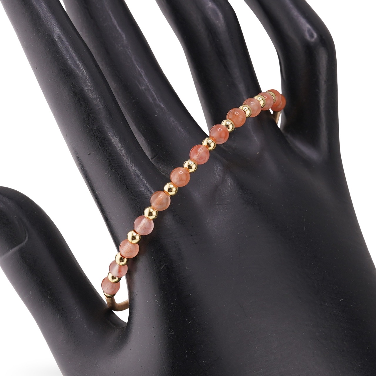 Această brățară reglabilă fără închidere cu Cuart Cherry este un accesoriu delicat, ușor de purtat zi de zi, potrivit pentru persoanele care preferă bijuteriile fine și feminine. Realizată din sfere de 4 mm din cristal sintetic, în nuanțe de roz, și completată de detalii metalice aurii, brățara are un aspect discret, luminos și ușor de integrat atât în ținute casual, cât și în combinații mai elegante.