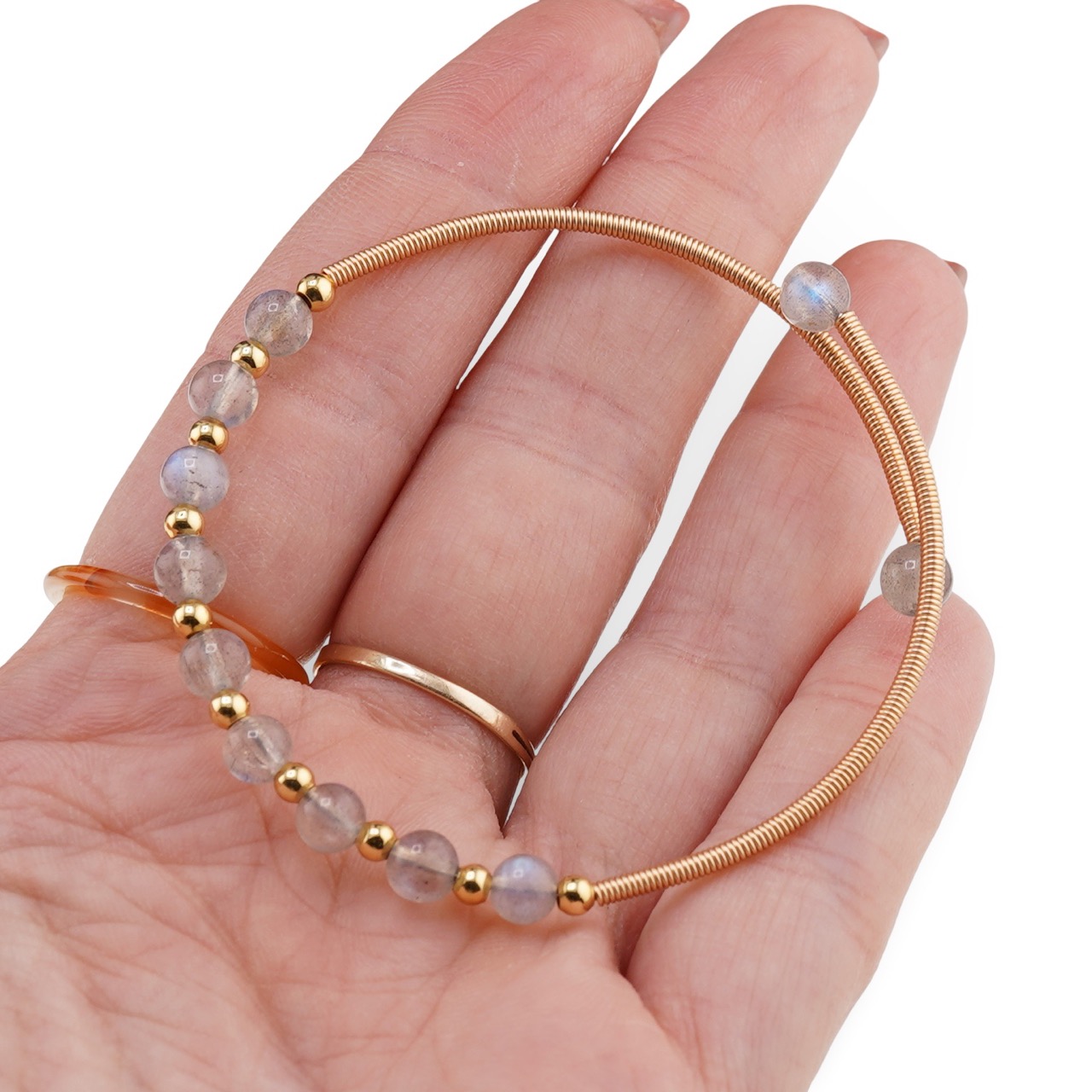 Această brățară reglabilă fără închidere cu Labradorit este o piesă delicată și ușor de purtat zi de zi, realizată din sfere de cristal natural de 4 mm, completate de accente metalice în nuanțe de auriu și gri. Designul flexibil îi permite să se ajusteze simplu pe încheietură, ceea ce o face practică atât pentru purtare individuală, cât și în combinație cu alte brățări fine. Aspectul discret, dar expresiv, pune în valoare reflexiile specifice labradoritului, o piatră semiprețioasă apreciată atât pentru frumusețea sa naturală, cât și pentru simbolistica sa.