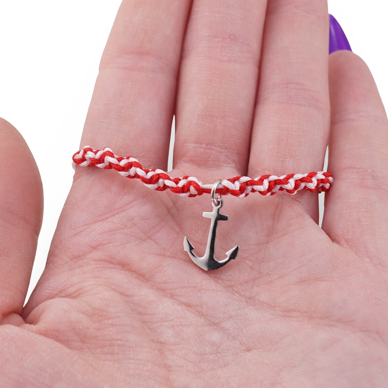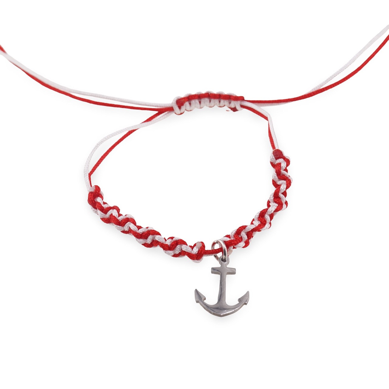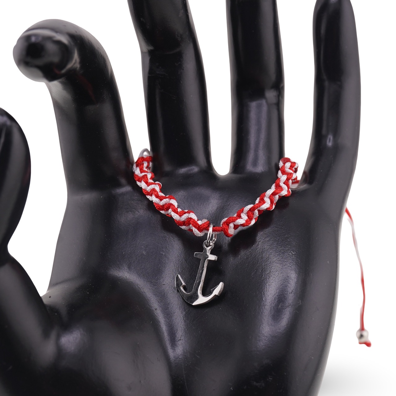 Bratara reglabila, snur alb si rosu cu charm ancora