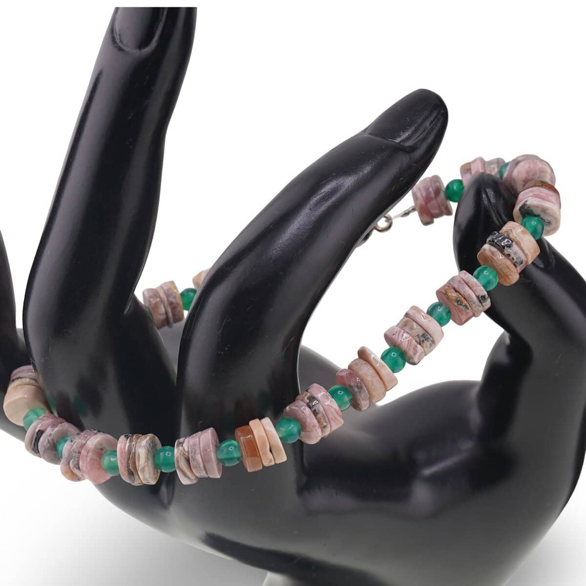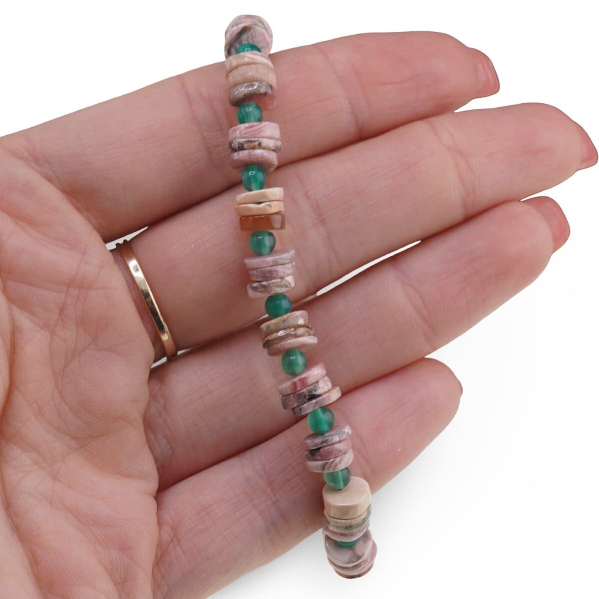 Bratara din rodocrozit cu discuri de 6–7 mm si onix verde sub forma de sfere fine de 3–4 mm este gandita pentru tine daca iti doresti mai multa stabilitate interioara si deschidere a inimii. Contrastul dintre rozul cald al rodocrozitului si verdele profund al onixului creeaza un accesoriu placut, usor de integrat in tinutele de zi cu zi, dar si in momentele in care ai nevoie de conectare cu tine insuti.