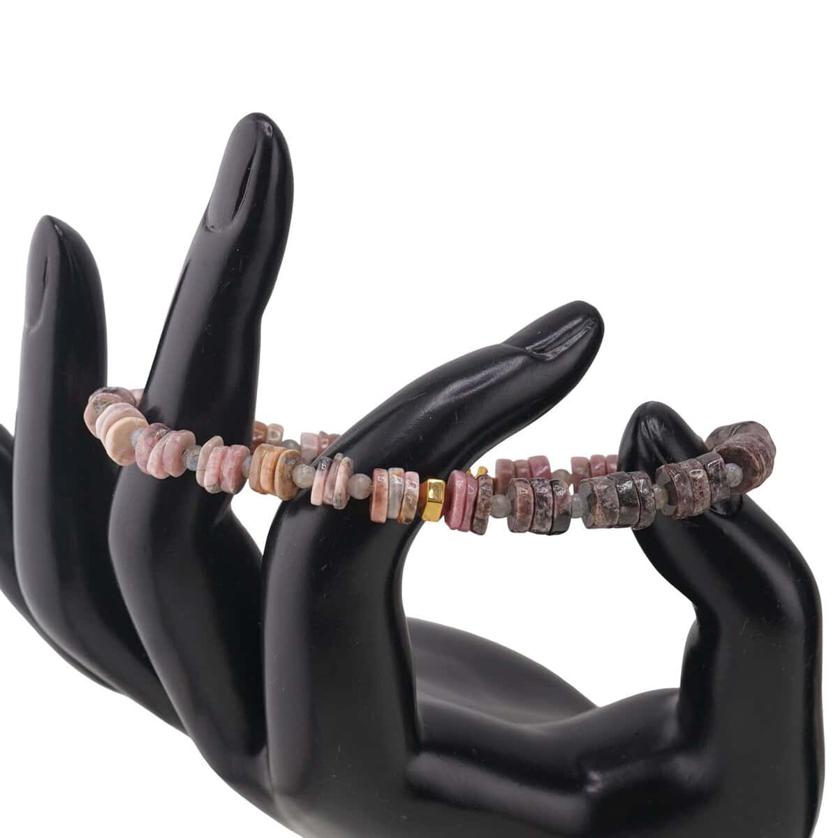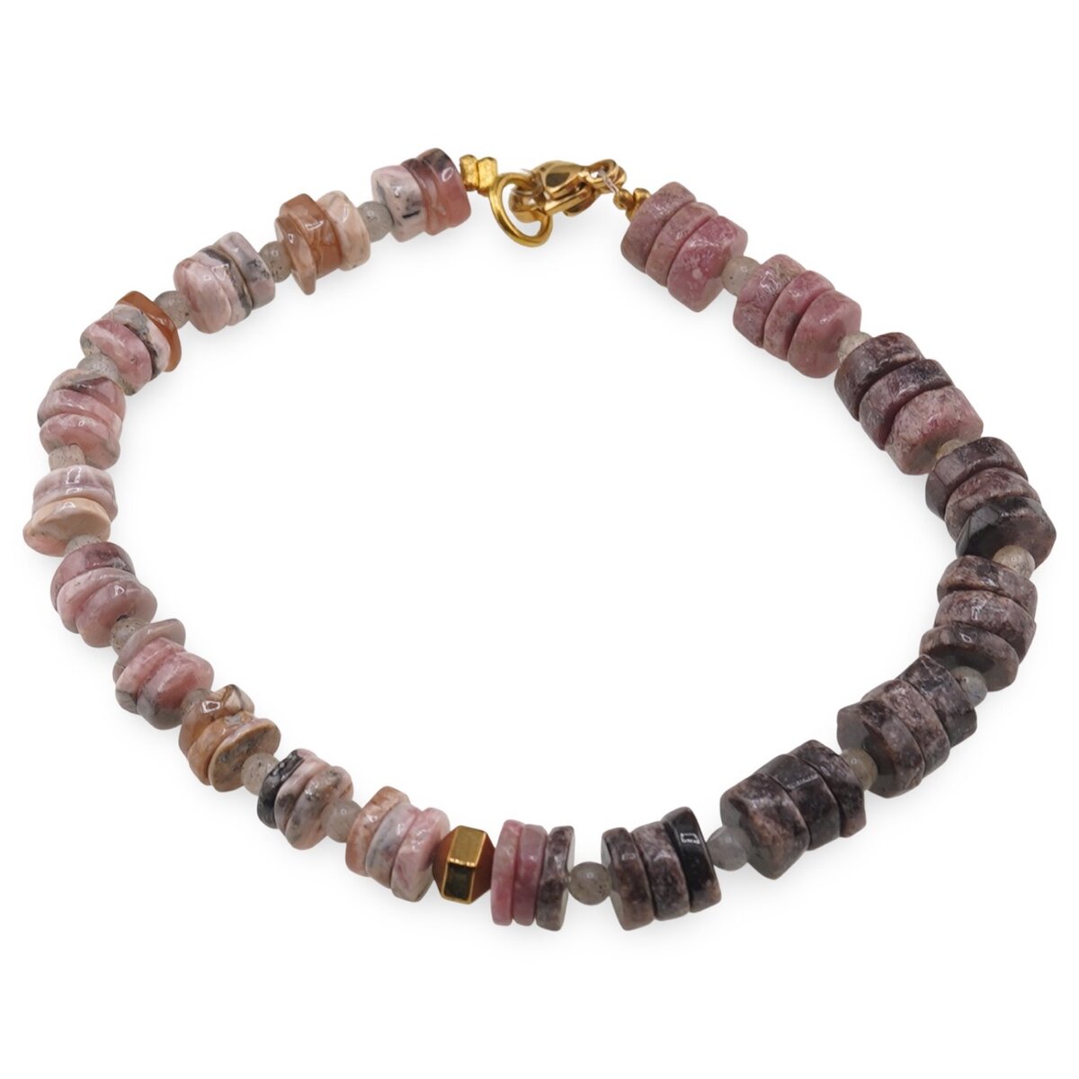 Bratara din rodonit, rodocrozit, labradorit si hematit auriu este creată pentru tine dacă îți dorești mai mult echilibru emoțional, claritate mentală și o legătură mai blândă cu propriul suflet. Nuanta naturală de roz a rodonitului și rodocrozitului, sub formă de rondele de aproximativ 6–7 mm, se combină armonios cu micile sfere de labradorit de 3 mm și cu accentele de hematit auriu, din inox auriu, formând o brățară elegantă și discretă, potrivită pentru fiecare zi.