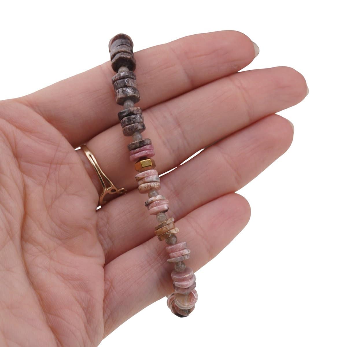 Poartă Bratara Rodonit si Rodocrozit rondele 6-7mm, Labradorit 3mm si Hematit auriu ca un memento delicat al iubirii de sine, al protecției și al echilibrului interior. Lasă combinația de roz blând, reflexe de labradorit și strălucire aurie să te însoțească în fiecare zi și alege să-ți transformi rutina într-un mic ritual de grijă pentru sufletul tău.
