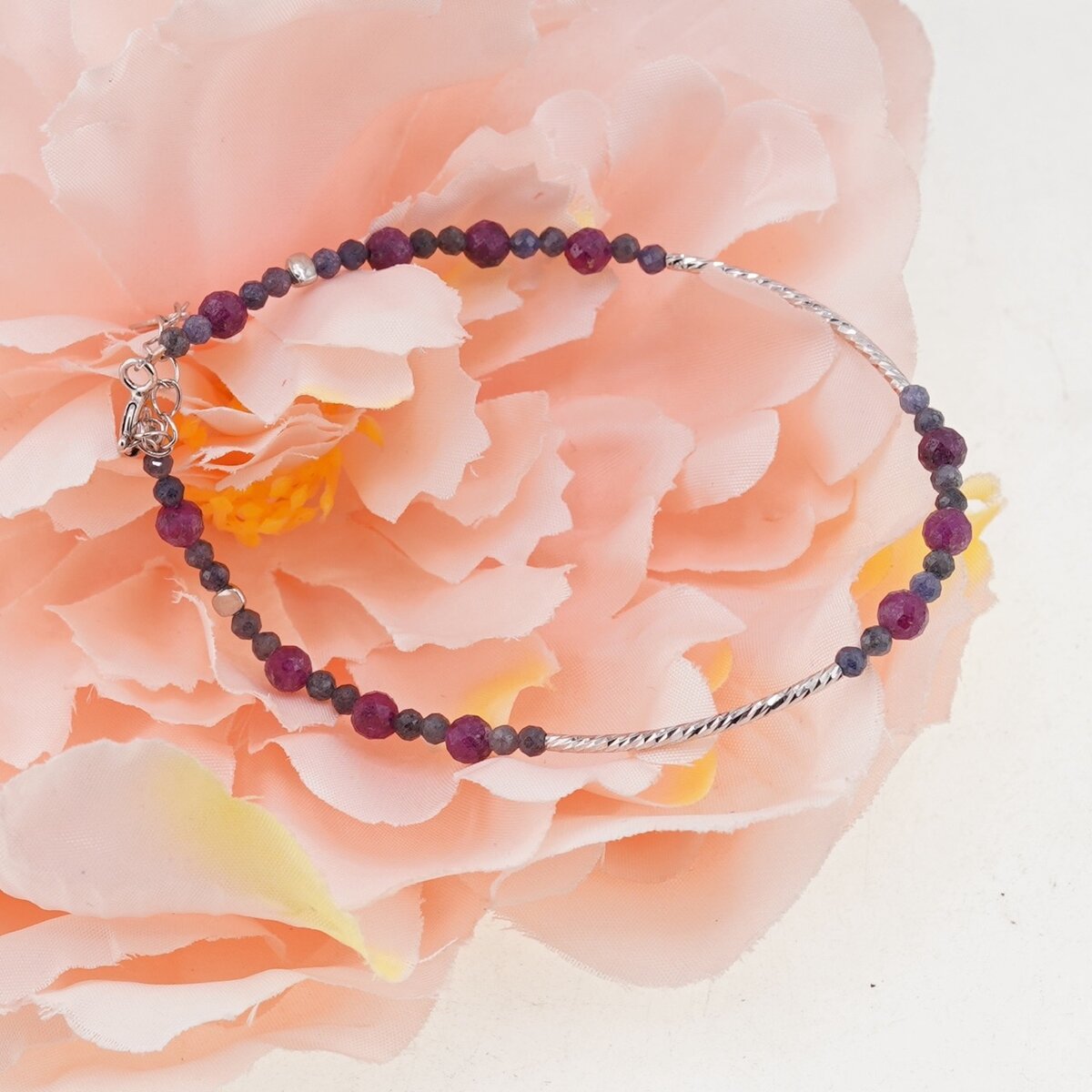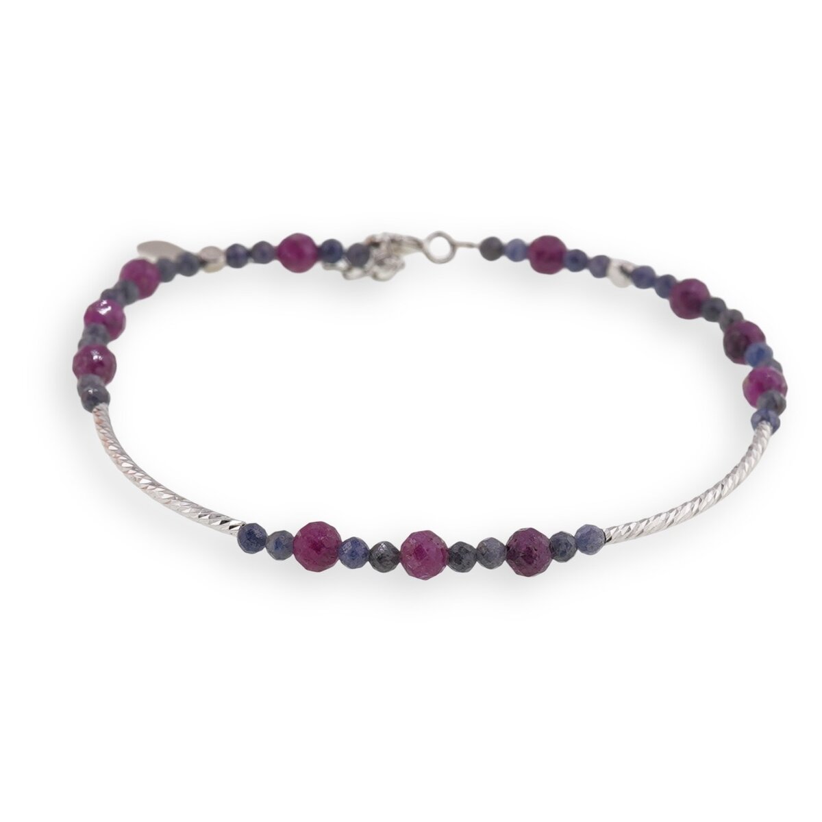 Realizată din cristale naturale 100% – safir de aproximativ 3 mm și rubin de aproximativ 4 mm – brățara combină nuanțe de albastru și roșu într-un contrast echilibrat. În tradițiile cristalelor, rubinul (Corindon roșu, „piatra pasiunii”) este asociat cu curajul, încrederea în sine, energia și vitalitatea, în timp ce safirul (Corindon albastru, „piatra regalității”) este apreciat pentru claritate mentală și protecție energetică. Împreună, creează un talisman purtat adesea pentru susținerea abundenței, stabilității și a unei minți limpezi.