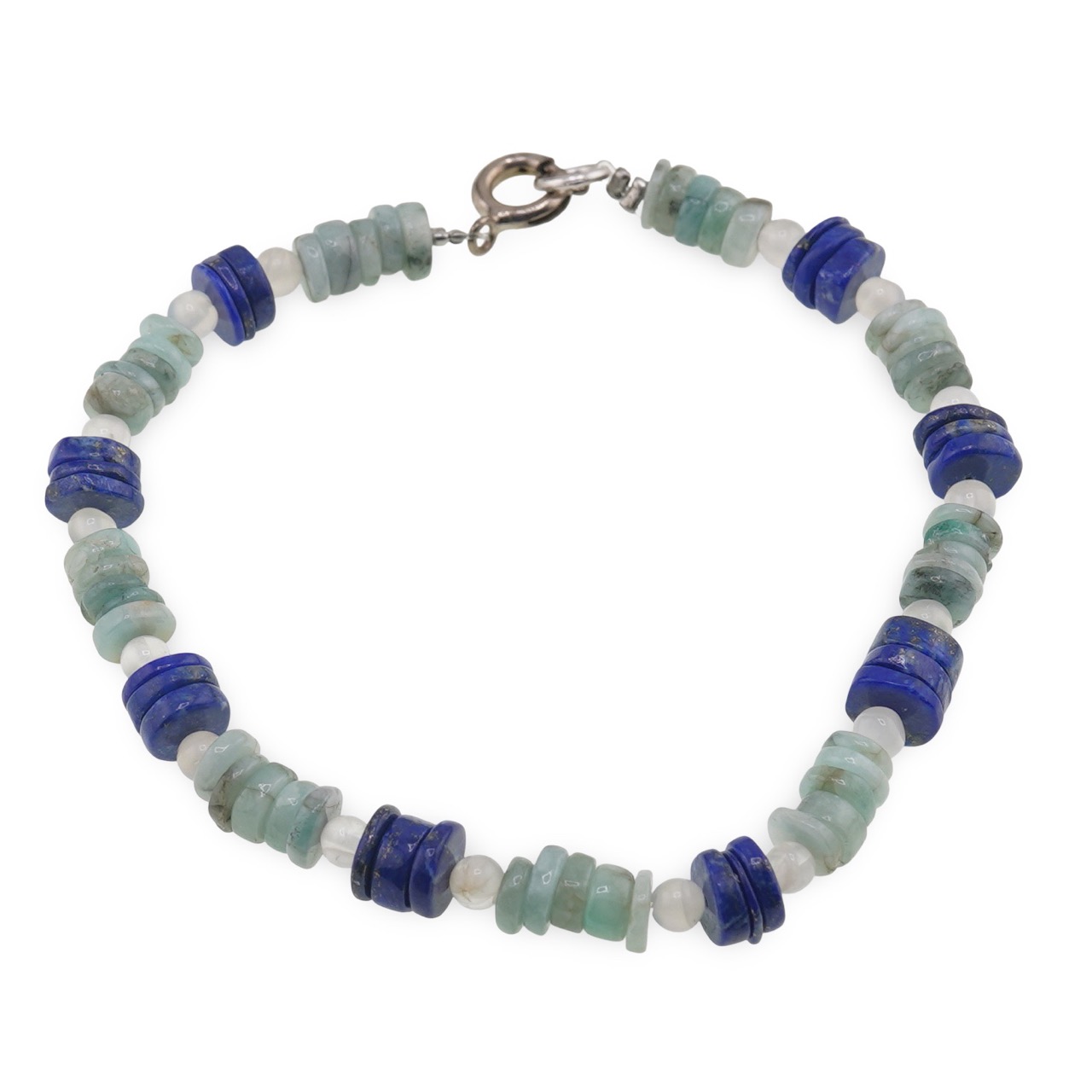 Bratara Smarald si Lapis Lazuli cu Piatra Lunii îmbină nuanțele de verde, albastru intens și alb lăptos într-un accesoriu delicat, potrivit pentru tine dacă îți dorești mai multă claritate interioară și echilibru emoțional. Discurile de smarald și lapis lazuli de aproximativ 5–6 mm se împletesc armonios cu micile sfere de Piatra Lunii de 3 mm, creând un joc de culori plăcut și discret, ușor de purtat în fiecare zi.