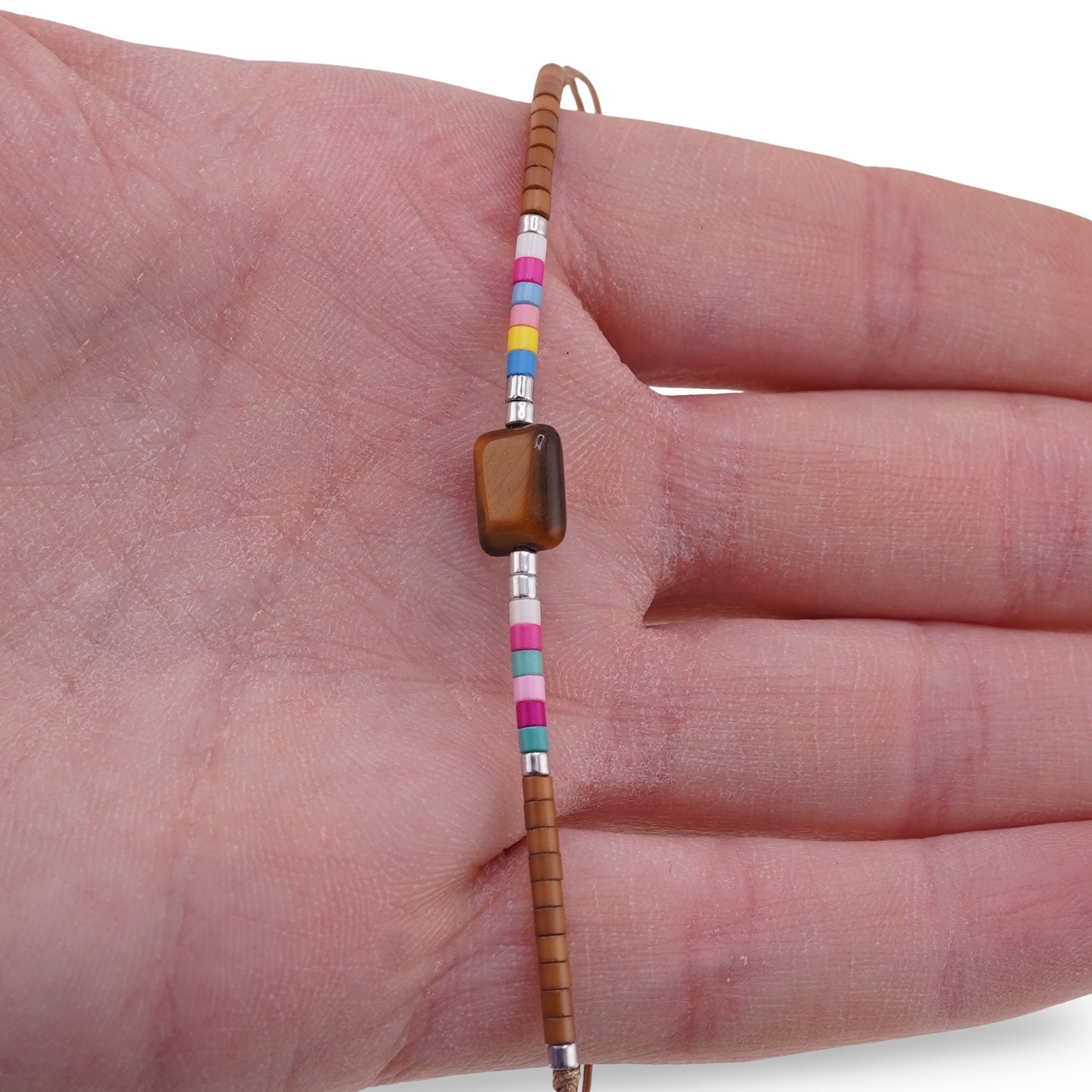 Bratara cu snur reglabil din Ochi de tigru dreptunghiular si elemente colorate este creată pentru tine dacă îți dorești mai mult calm, curaj și energie în viața de zi cu zi. Cristalul natural de Ochi de tigru, cunoscut și ca „Piatra curajului” sau Tiger’s Eye, are o nuanță caldă de maro, pusă în valoare de forma geometrică simplă, ușor de integrat în orice stil.