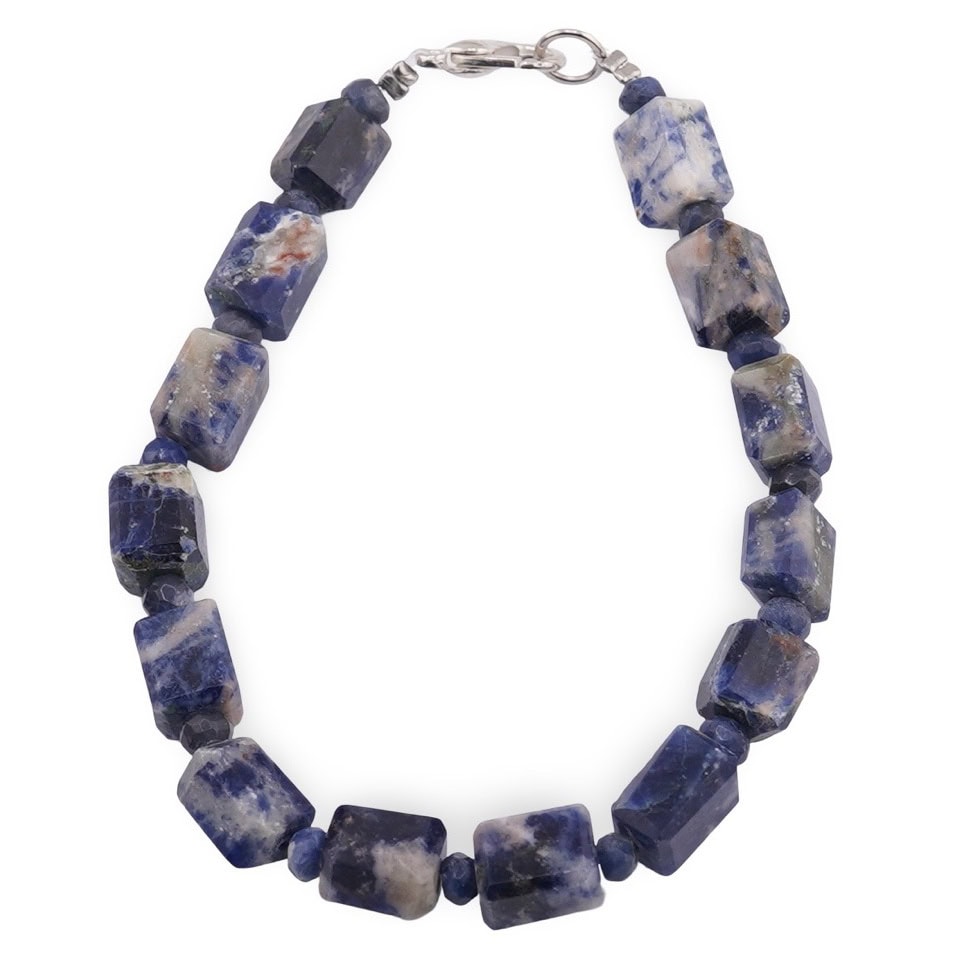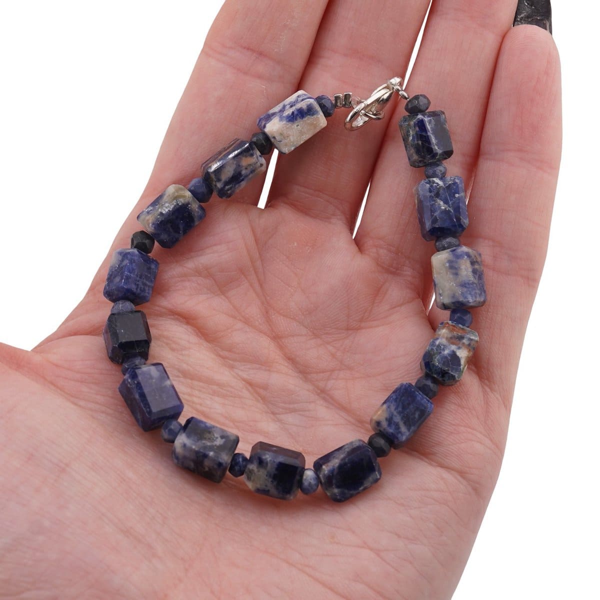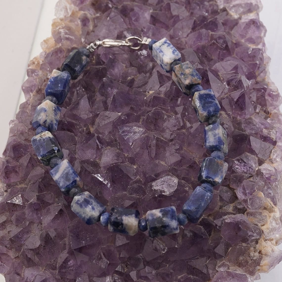 Brățara din sodalit aduce aproape de tine albastrul profund al acestui cristal natural 100%. Pietrele sunt tăiate în dreptunghiuri fațetate de 8–9 mm și sunt completate de discuri fine de 4 mm, creând o textură elegantă care prinde lumina la fiecare mișcare. Accesorizată discret cu elemente metalice din metal comun sau argint 925, brățara se potrivește ușor în ținutele de zi și în momentele în care vrei să îți păstrezi mintea limpede.