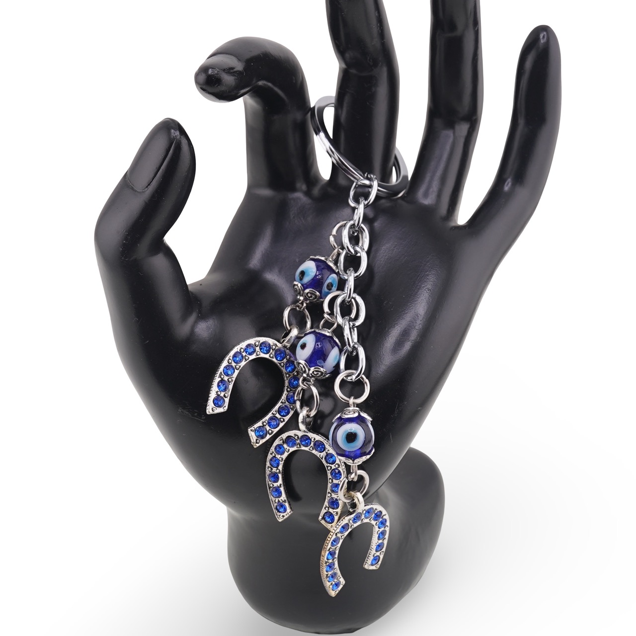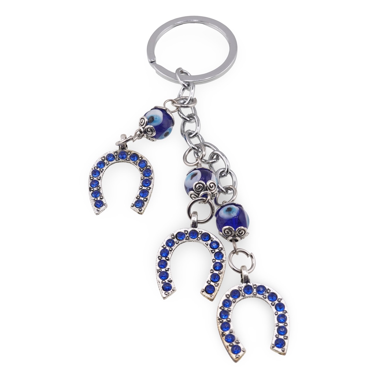 Cele trei potcoave dispuse armonios sugerează deschiderea către oportunități și susțin ideea de drum liber în fața ta. Combinate cu ochii protectori, cunoscuți pentru rolul lor de scut împotriva energiilor nedorite, aceste simboluri transformă brelocul într-un talisman pe care îl poți avea mereu la îndemână, fie că îl folosești pentru cheile de acasă, de la mașină sau îl agăți la o geantă ori un rucsac.