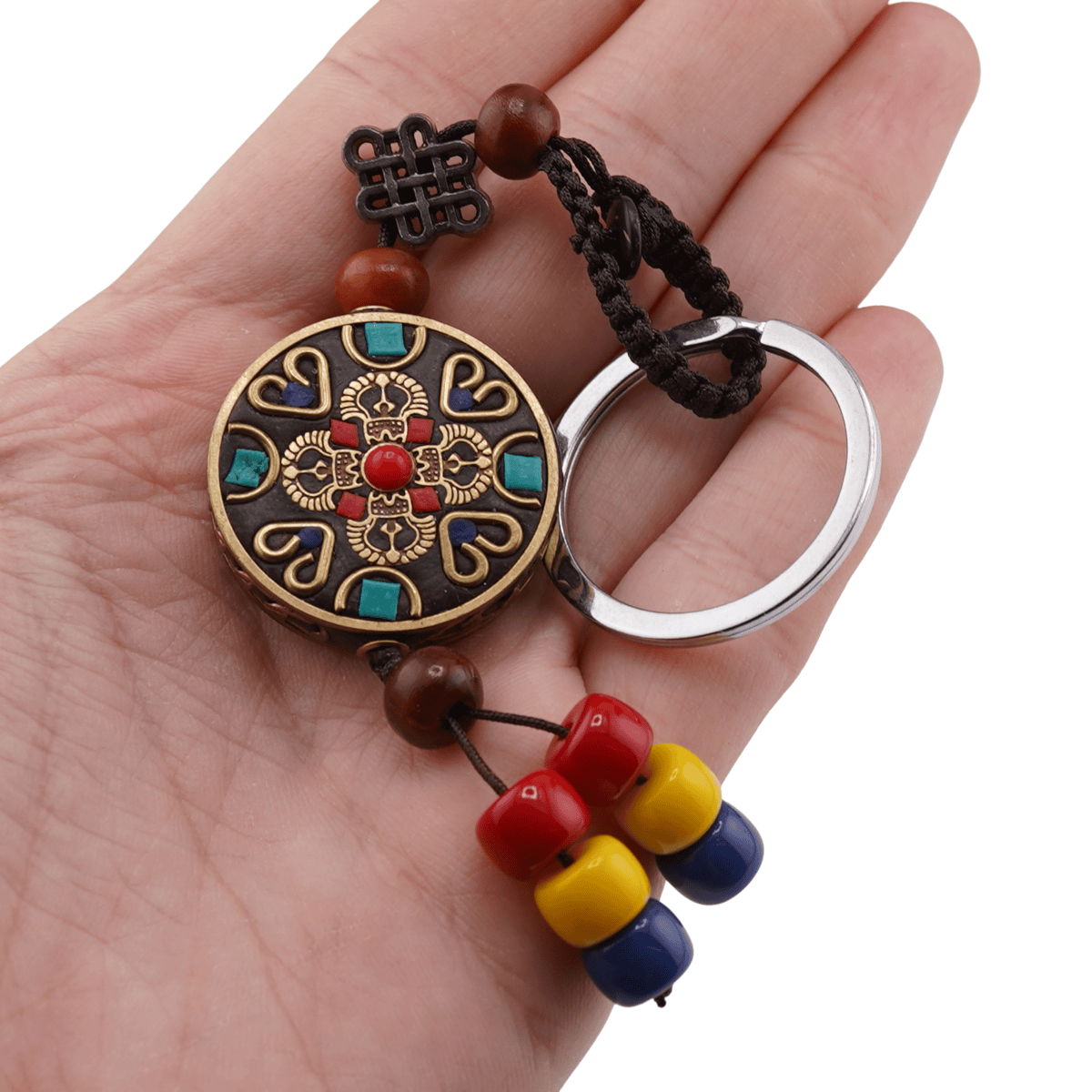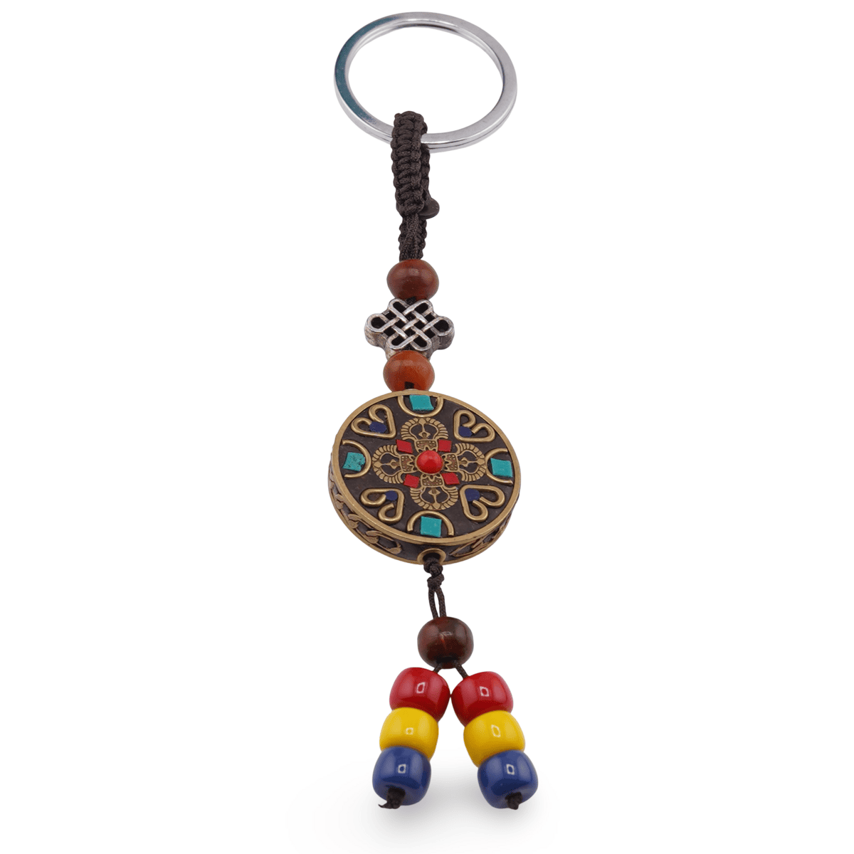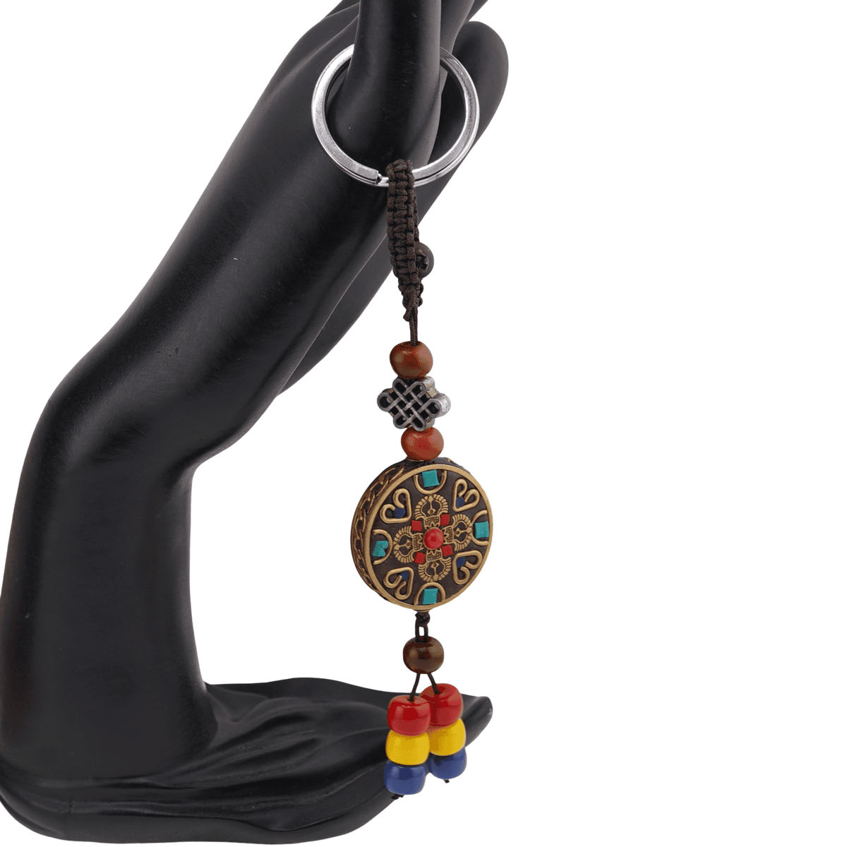 Breloc tibetan rotund cu model dublu dorje, margele rosii galbene albastre, 14cm