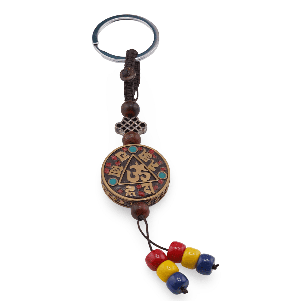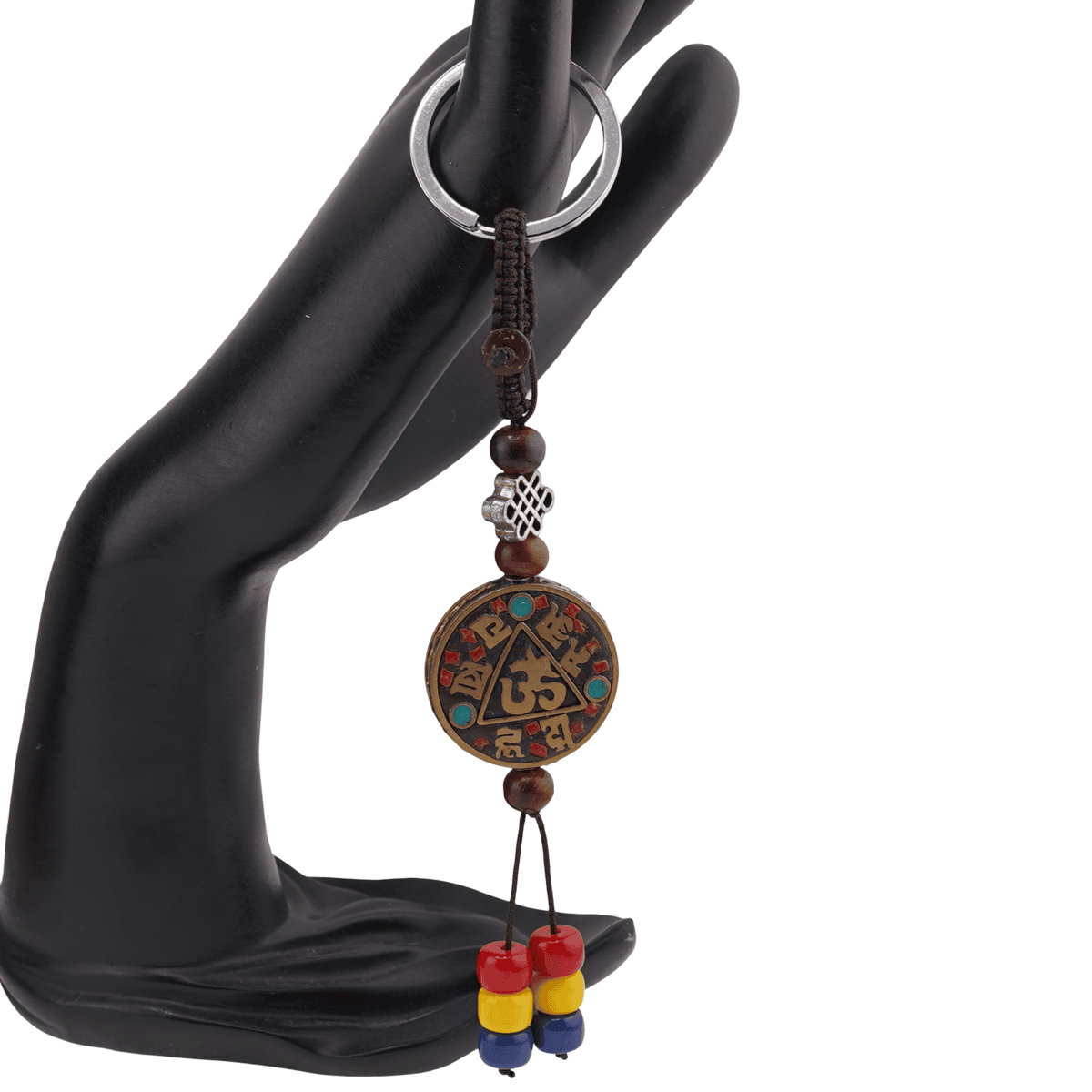 Breloc tibetan rotund cu model OM, margele rosii galbene albastre, 14cm