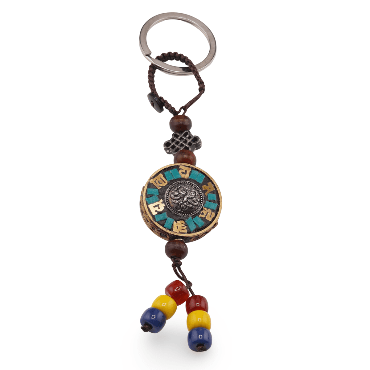 Breloc tibetan rotund cu model scoica argintie, margele rosii galbene albastre, 14cm