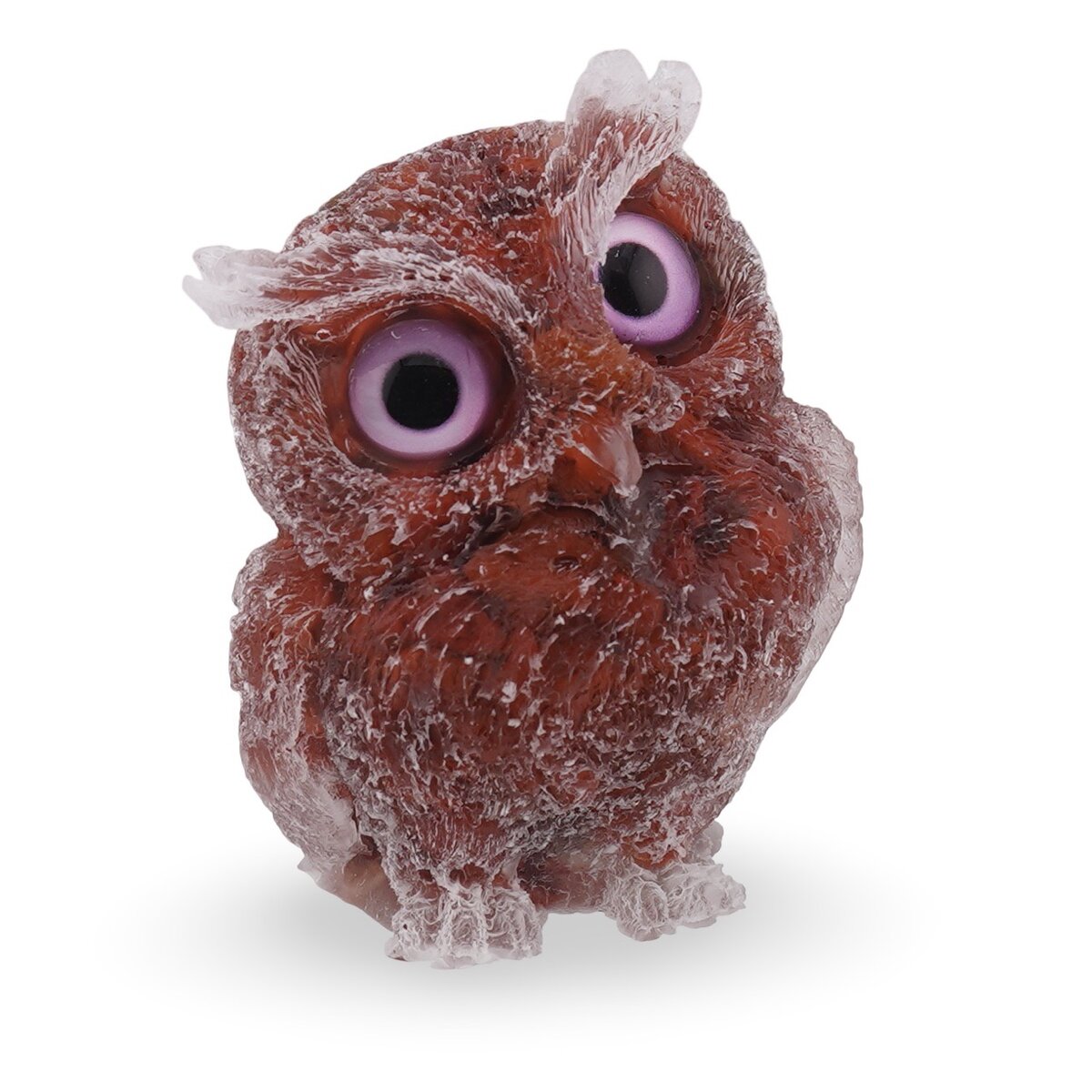 Modelul este realizat sub forma unei bufnițe gravate, iar spărtura de jasp roșu oferă un aspect aparte fiecărei piese. Nuanța roșie aduce căldură vizuală și pune în valoare textura naturală a pietrei, ceea ce face ca fiecare figurină să aibă un farmec propriu. Fiind un produs care combină cristal natural 100% cu rășină, este potrivit atât pentru colecționari de figurine din piatră, cât și pentru cei care caută un obiect decorativ discret, dar expresiv.