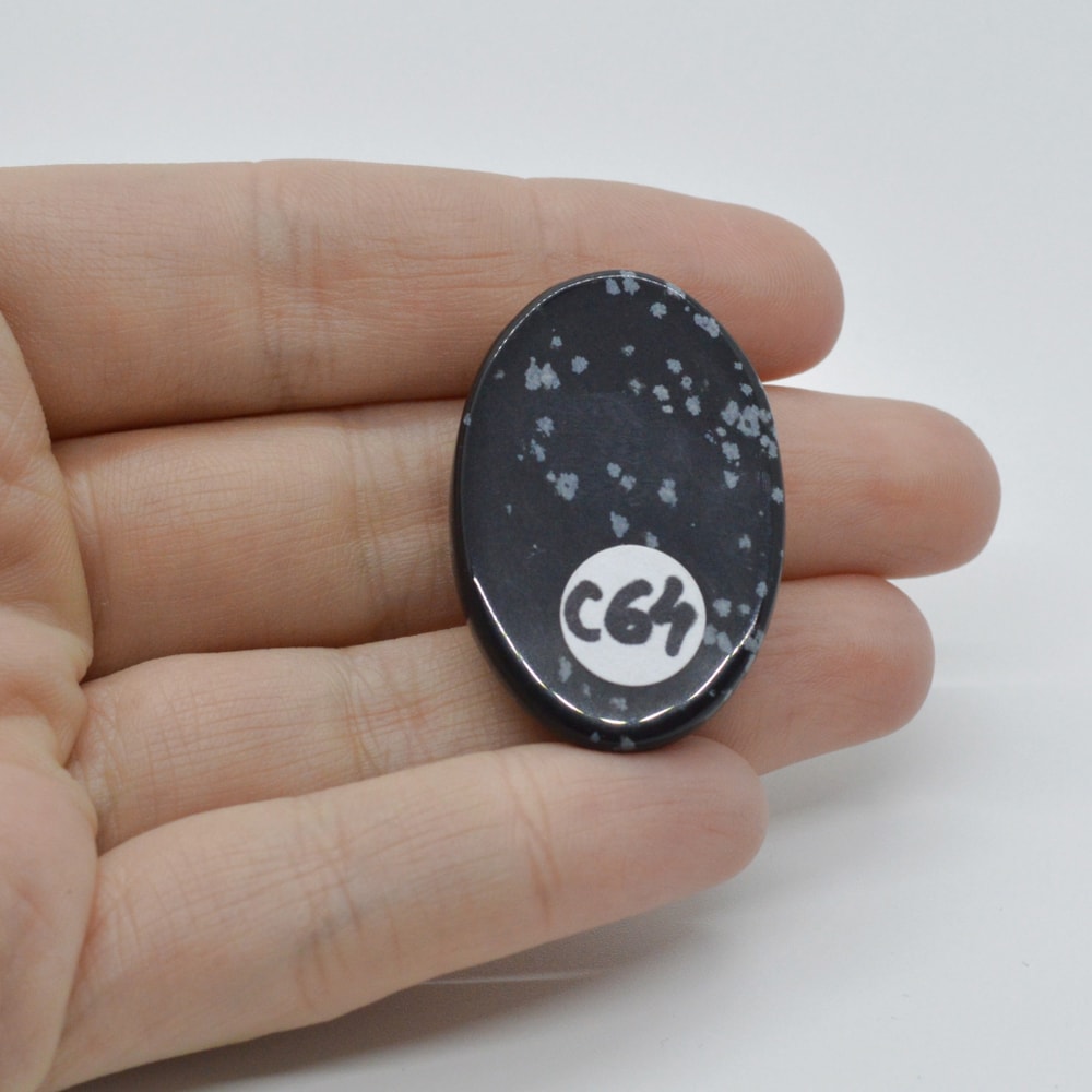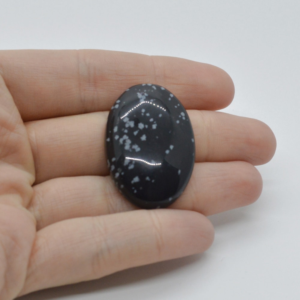Piatra semipretioasa naturala pentru montat in bijuterii, Cabochon Obsidian Fulg de nea 35x23x7mm C64. Se ofera certificat de garantie si conformitate.