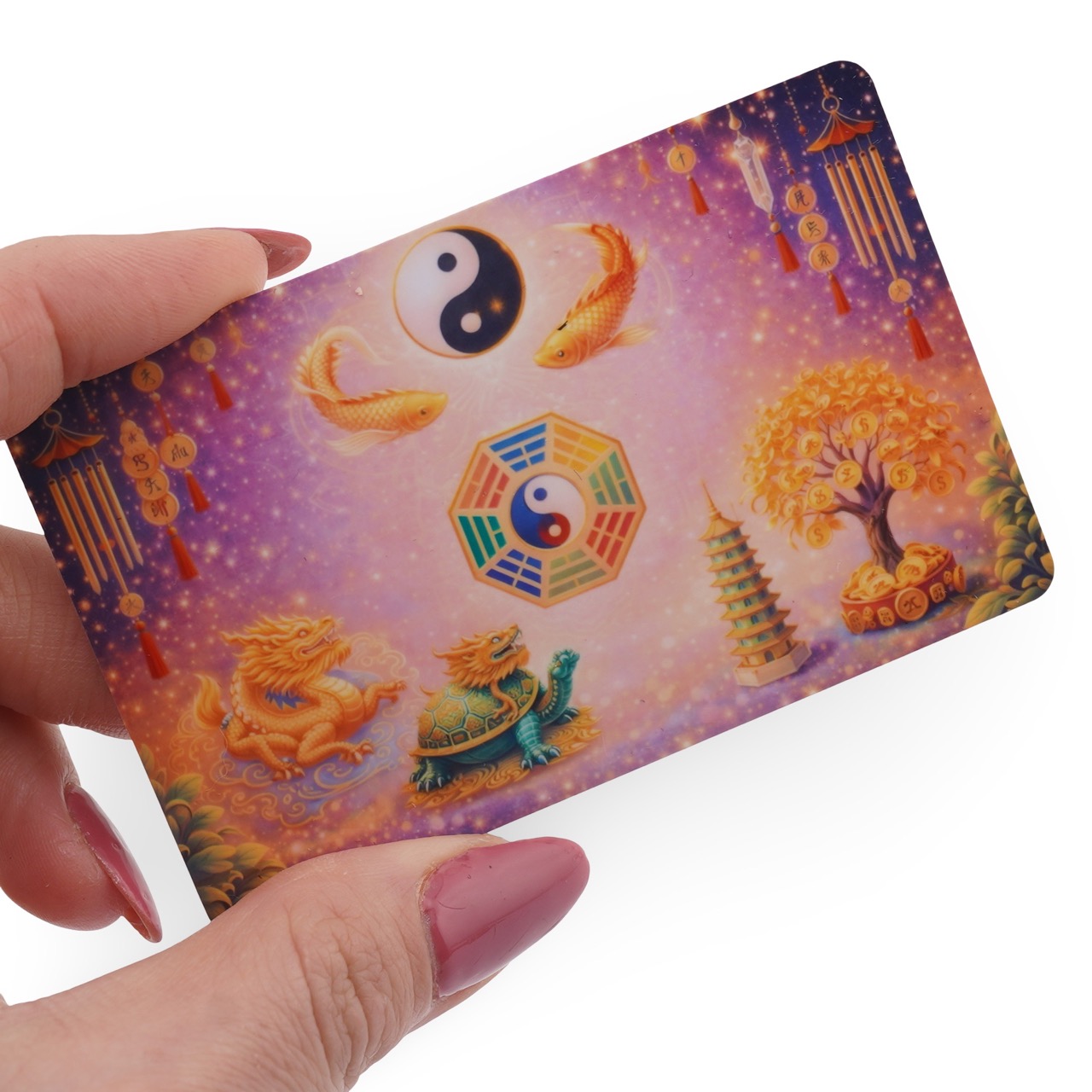 Pe card apar cerbul sacru, Yin-Yang, hexagrama Bagua, peștii Koi, dragonul, țestoasa, pagoda și arborele bogăției, Ying Yang, clopotei de vant