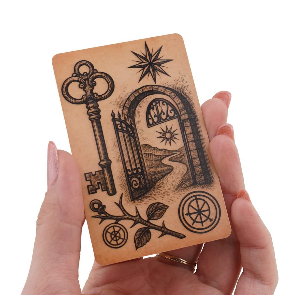 În centrul acestui card amuletă se află o mantră care susține energetic intenția de a avansa: „Prin Cheia cea veche și Steaua cu opt raze, porțile mi se deschid una câte una. Drumul meu se luminează înainte.” O poți rosti în gând sau cu voce tare atunci când ai nevoie de curaj, când pornești un proiect nou sau când simți că vrei să lași în urmă o etapă veche.