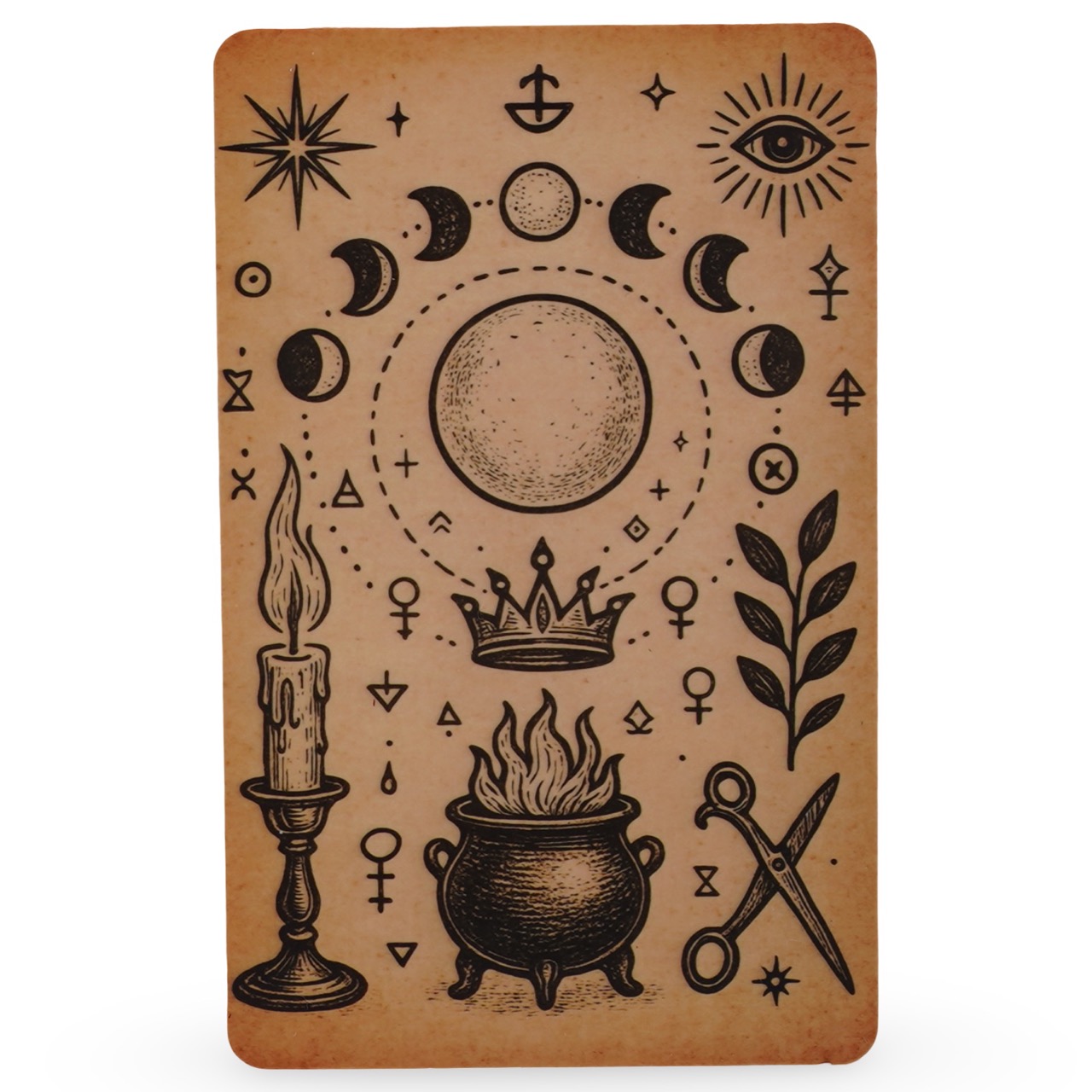 Pe card se vad: luna plina, semiluna, fazele lunii, stele, ochi mistic, lumanare aprinsa, coroana, cazan ritualic, frunze, foarfeca magica, simboluri planetare si mantra cardului.