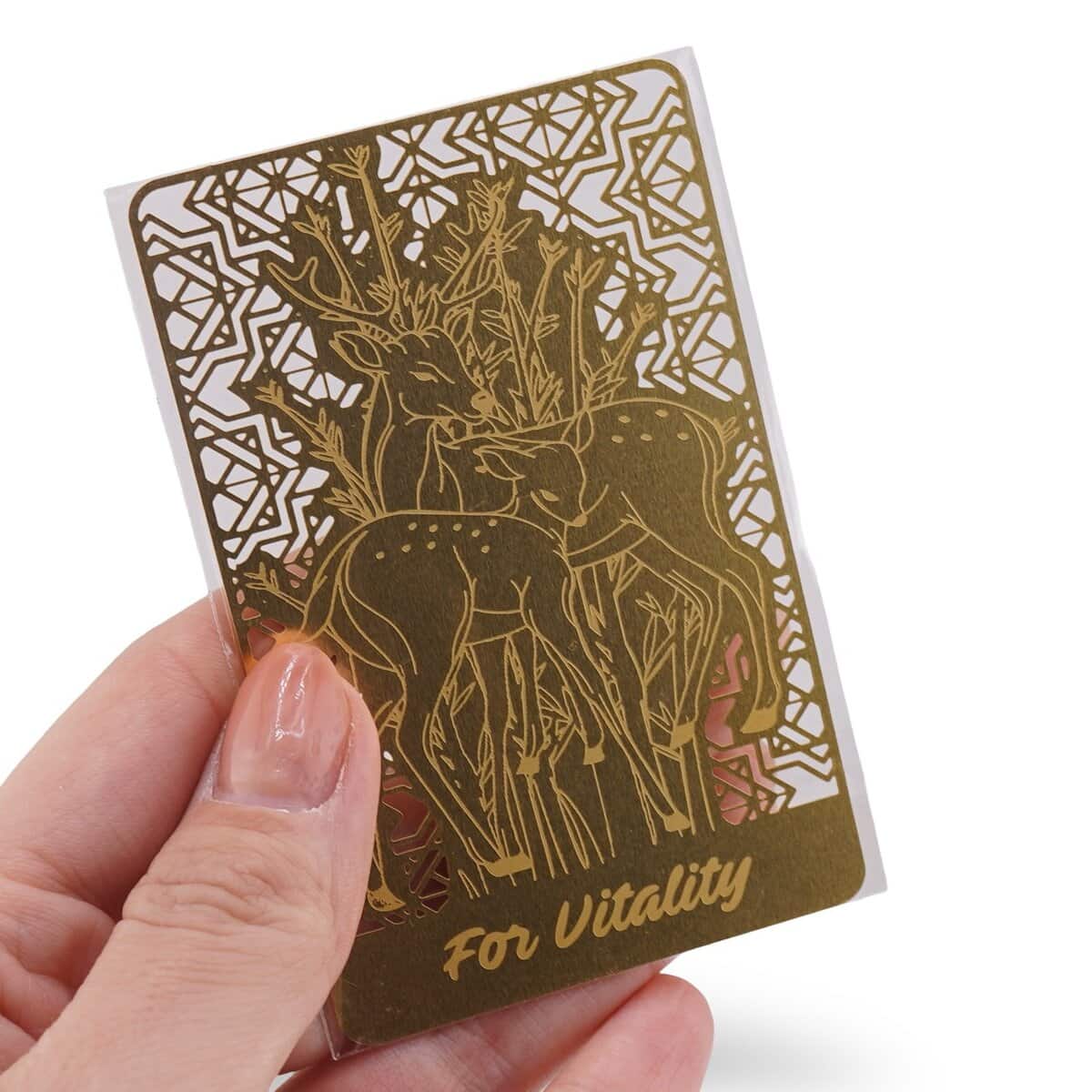 Realizat din metal cu finisaj auriu, cardul are forma dreptunghiulară și dimensiunile aprox. 85 x 53 mm, cu grosime de 1 mm, astfel încât să fie confortabil de purtat în portofel sau într-o husă de carduri. Suprafața sa pune în valoare detaliile simbolurilor fără a ieși în evidență ostentativ, potrivindu-se cu ușurință stilului de zi cu zi. Este un accesoriu discret, dar cu mesaj clar pentru cine caută să-și mențină energia vie și focusul bine așezat.