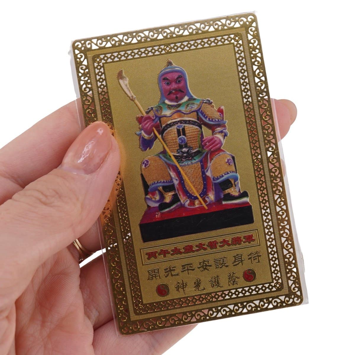 Deși poartă o estetică metalică, cardul este realizat din plastic rezistent, gândit să facă față uzurii zilnice. Culorile auriu și roșu se potrivesc bine cu un decor cald sau cu spațiile de lucru, iar finisajul atent pune în valoare simbolistica Tai Sui. Forma simetrică, ușor de recunoscut, te invită să-l integrezi firesc în rutina ta.