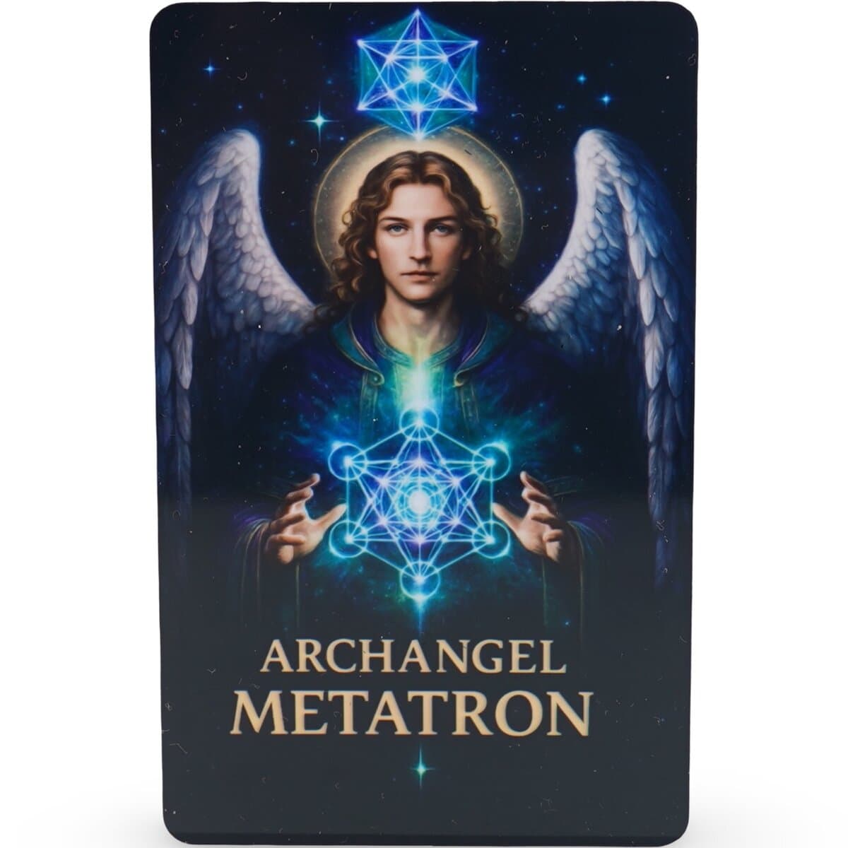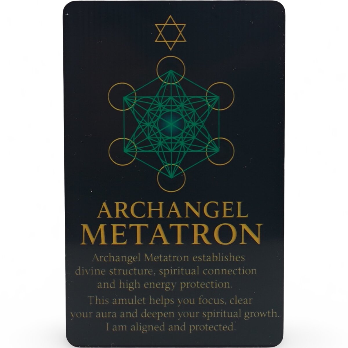 Pe card se vad: portretul arhanghelului, aripile, aureola, steaua geometrica luminoasa deasupra capului, Cubul lui Metatron radiind energie in fata pieptului, simbolul stelei si Cubul lui Metatron pe verso, textul cu mesajul/mantra asociată.