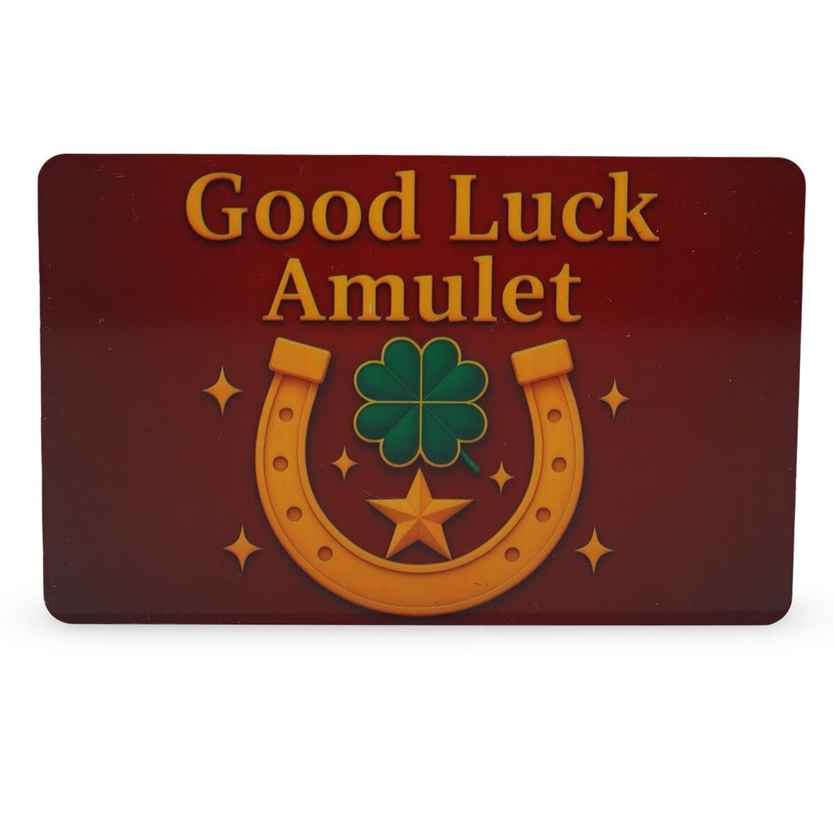 Pe card se vad: titlul „Good Luck Amulet”, potcoava, trifoiul cu patru foi, stea, stelele, mantra „I attract luck, opportunities and positive energy.”, nodul mistic, lingoul auriu, monedele chinezesti si Wu Lou pe verso.