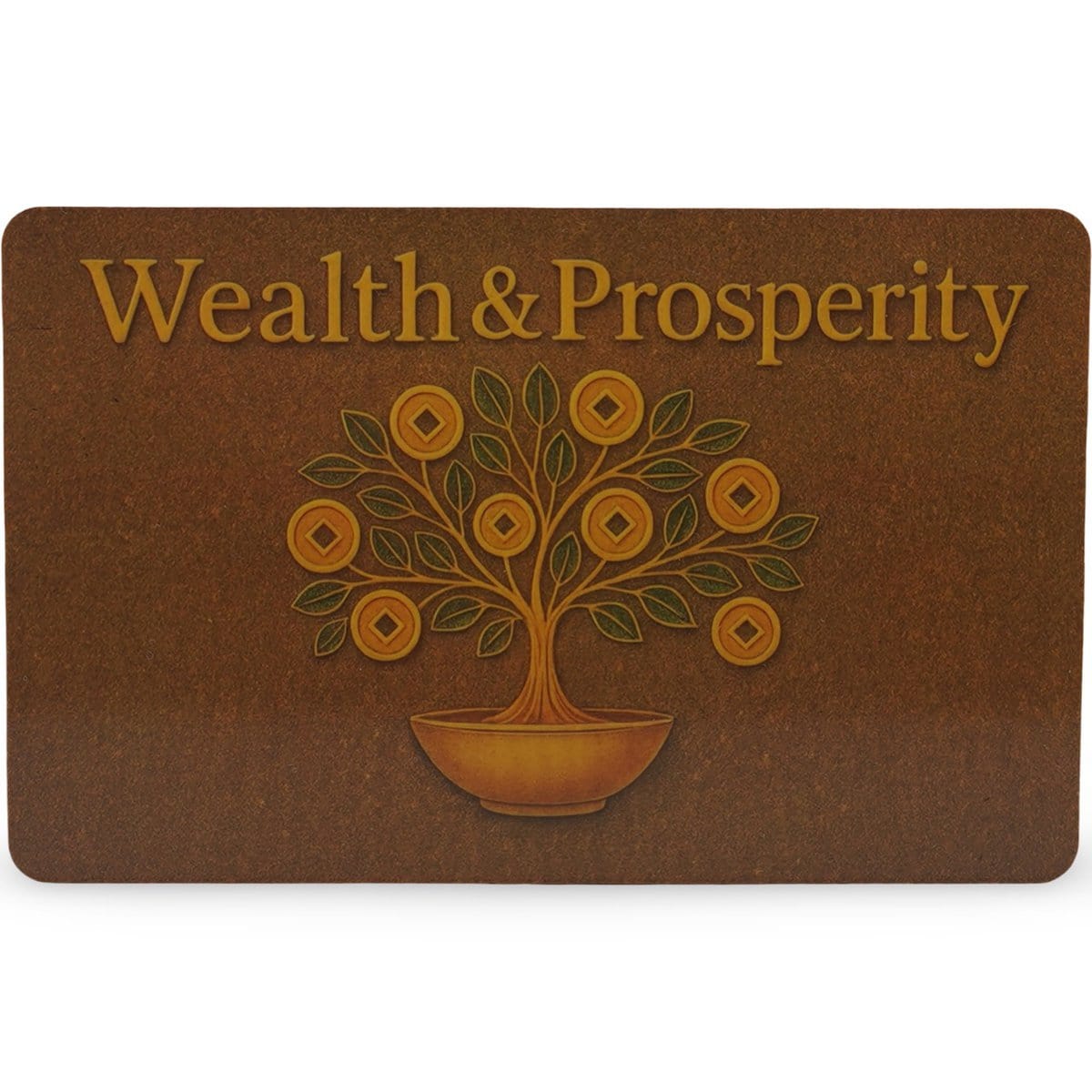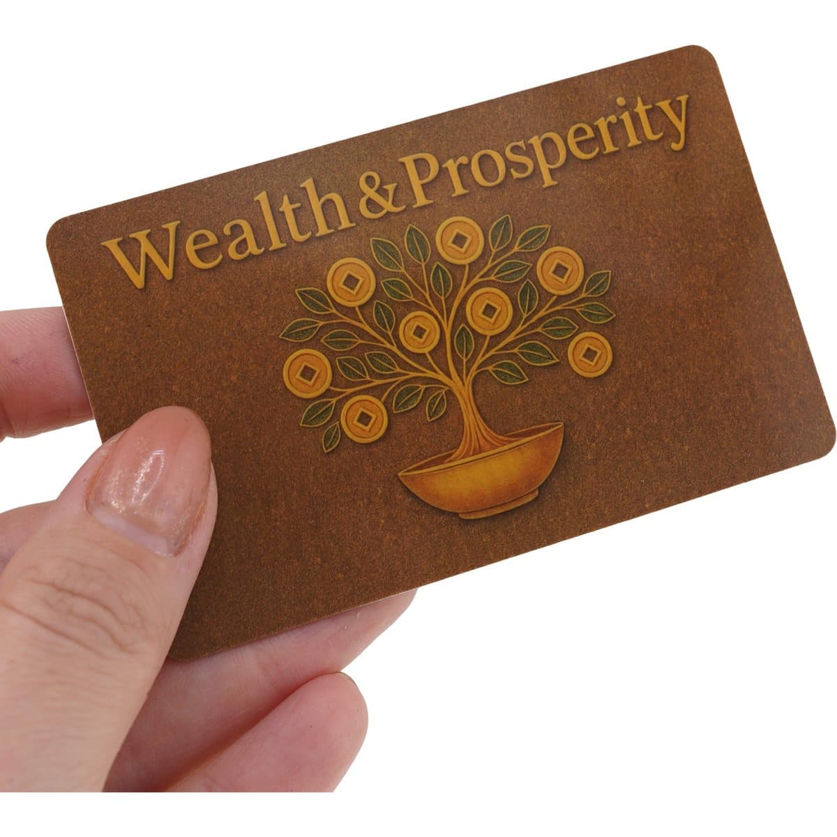 Pe card se vad: titlul „Wealth & Prosperity”, arborele abundentei cu monede aurii, mantra „I am aligned with wealth, growth and success.”, arbore de pe verso, lingoul auriu, monedele chinezești cu sfoara rosie si figurina leului protectiv.