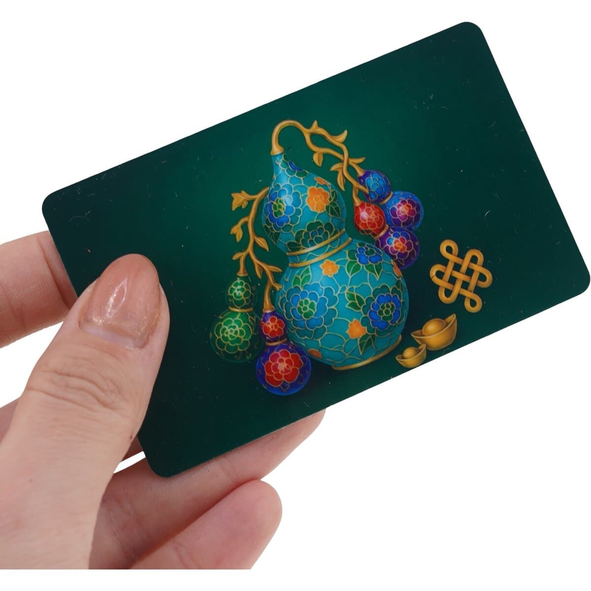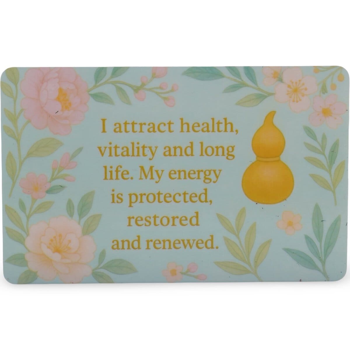 Pe card se vad: vasul Wu Lou mare cu motive florale, nodul mistic, lingourile aurii, florile decorative pe verso, frunzele verzi, Wu Lou si mantra „I attract health, vitality and long life. My energy is protected, restored and renewed.”