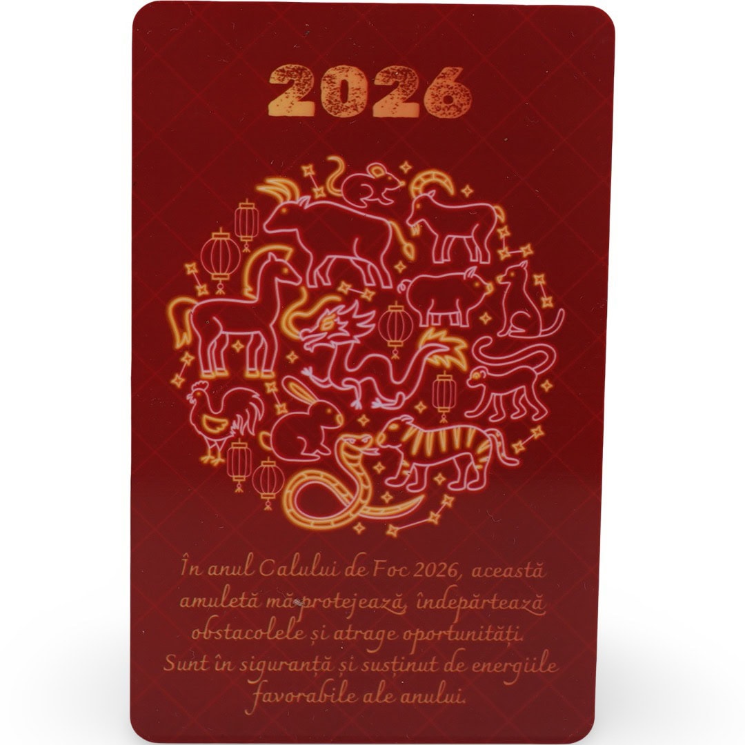 Pe card se văd silueta și numele zodiei Caine, alături de cele 12 zodii, astfel încât să simți legătura cu întregul ciclu zodiacal, nu doar cu semnul tău. Anul 2026 este evidențiat clar, împreună cu mesajul: „În anul Calului de Foc 2026, această amuletă mă protejează, îndepărtează obstacolele și atrage oportunități. Sunt în siguranță și susținut de energiile favorabile ale anului.” Acest text funcționează ca o afirmație pozitivă pe care o poți reciti ori de câte ori simți nevoia de sprijin interior.