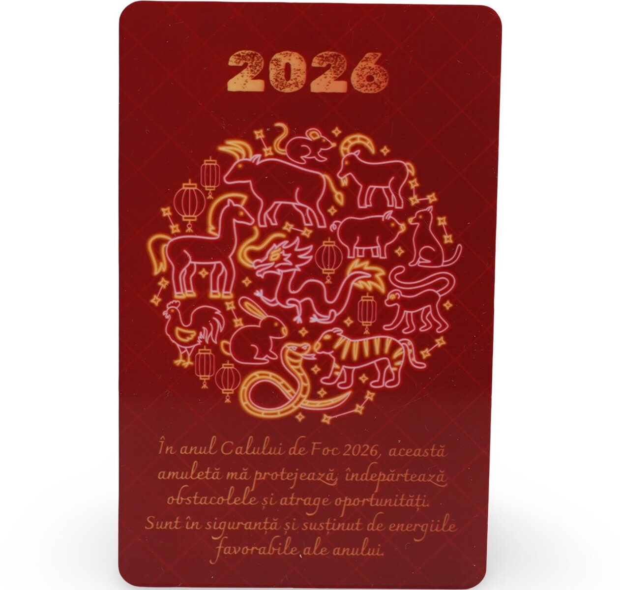 Tonurile de portocaliu și roșu sugerează energie, curaj și mișcare, ajutându-te să îți amintești, de fiecare dată când vezi cardul, că ai resursele interioare pentru a depăși obstacolele. Pe suprafața lui se regăsesc silueta și numele zodiei Cal, cele 12 zodii, mențiunea anului 2026, precum și afirmația: „În anul Calului de Foc 2026, această amuletă mă protejează, îndepărtează obstacolele și atrage oportunități. Sunt în siguranță și susținut de energiile favorabile ale anului.”