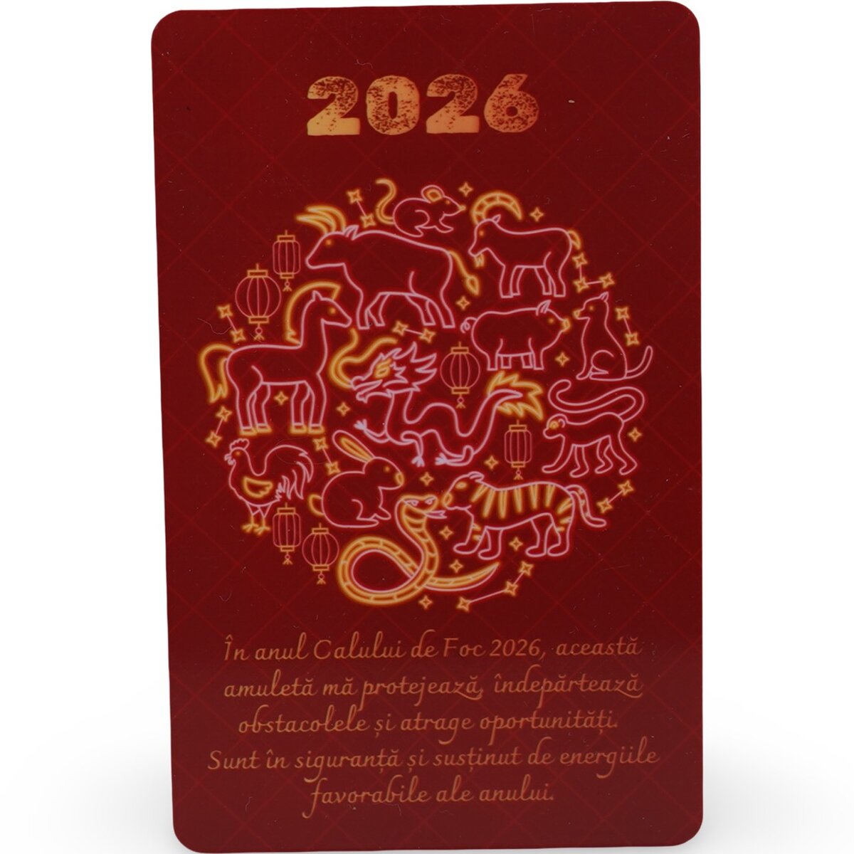 Realizat din PVC rezistent, cardul combină nuanțe de portocaliu și roșu, culori care transmit vitalitate, curaj și dinamism. Pe suprafața lui vei vedea silueta și numele zodiei Iepure, alături de toate cele 12 zodii, ceea ce îți amintește de legătura ta cu întregul cerc zodiacal. Este evidențiat anul 2026, însoțit de afirmația: „În anul Calului de Foc 2026, această amuletă mă protejează, îndepărtează obstacolele și atrage oportunități. Sunt în siguranță și susținut de energiile favorabile ale anului.”