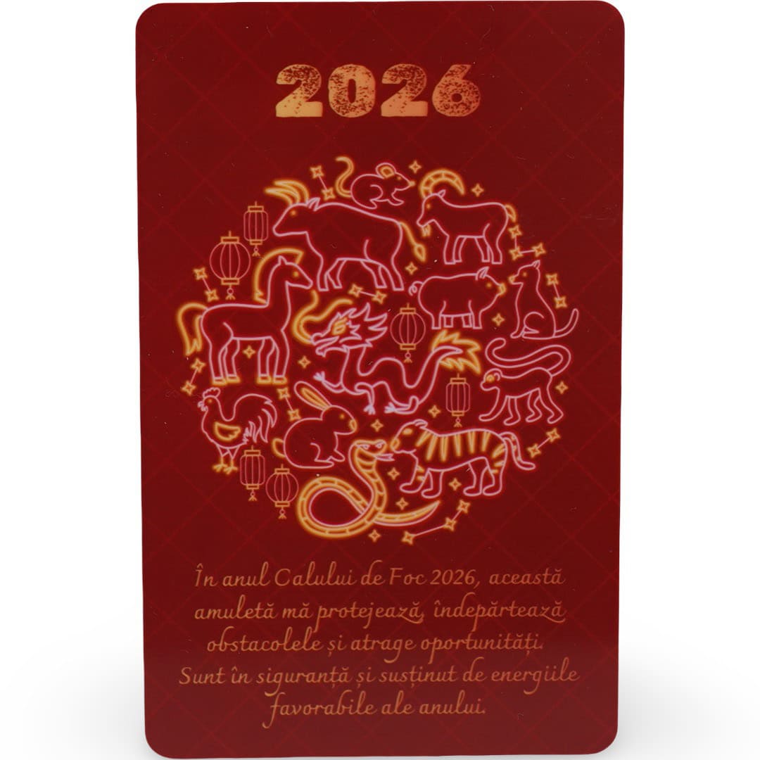 Realizat din PVC rezistent, cardul are o textură plăcută și poate fi păstrat cu ușurință în portofel, în husă de telefon sau în agenda ta zilnică. Nu ocupă mult spațiu, dar este mereu la îndemână atunci când ai nevoie de un moment de reconectare cu intențiile tale pentru anul Calului de Foc 2026.