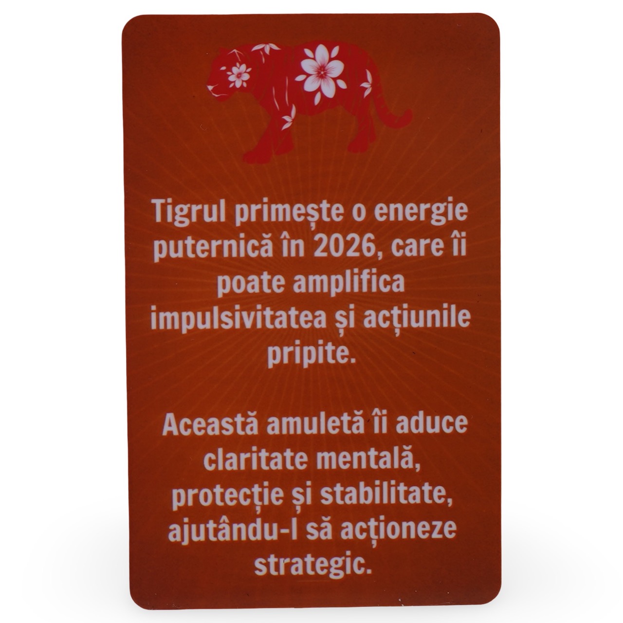 Pe card se vad: silueta Tigrului in cerc, Tigru decorativ rosu cu motive florale, text explicativ pentru energia zodiei in anul 2026