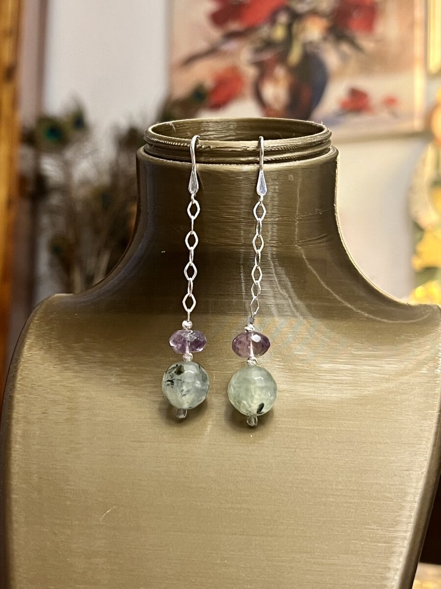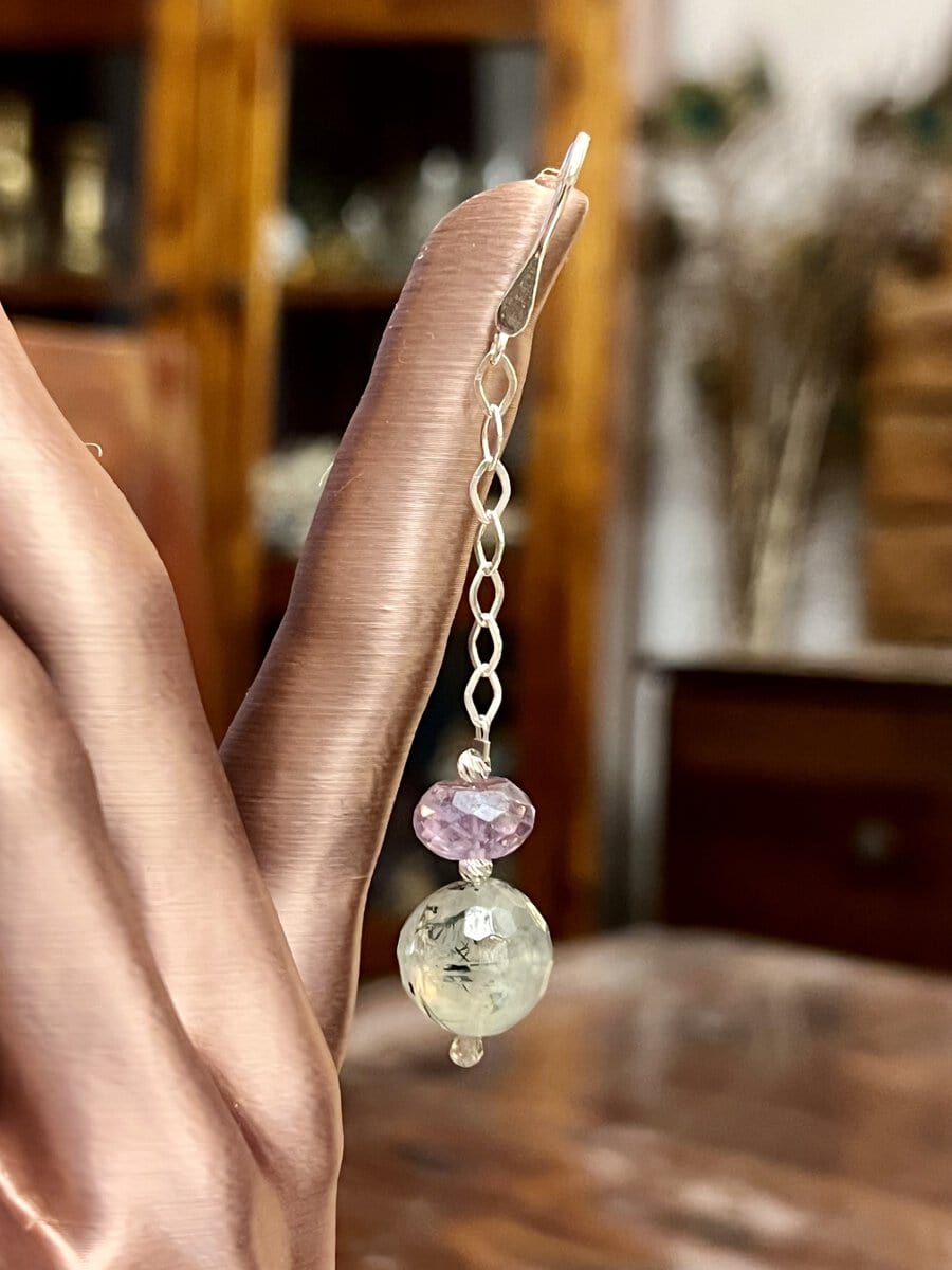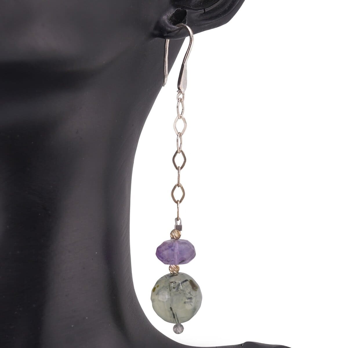 Acești cercei cu agățatoare îmbină armonios energia blândă a ametistului cu vibrația calmă a prehnitului, într-un design rafinat din argint 925. Discurile fațetate de ametist, cu nuanțe de mov profund, se așază elegant alături de sferele fațetate de prehnit, într-un verde plăcut, creând un joc de culori care atrage privirea și aduce un plus de echilibru în ținutele tale de zi cu zi.