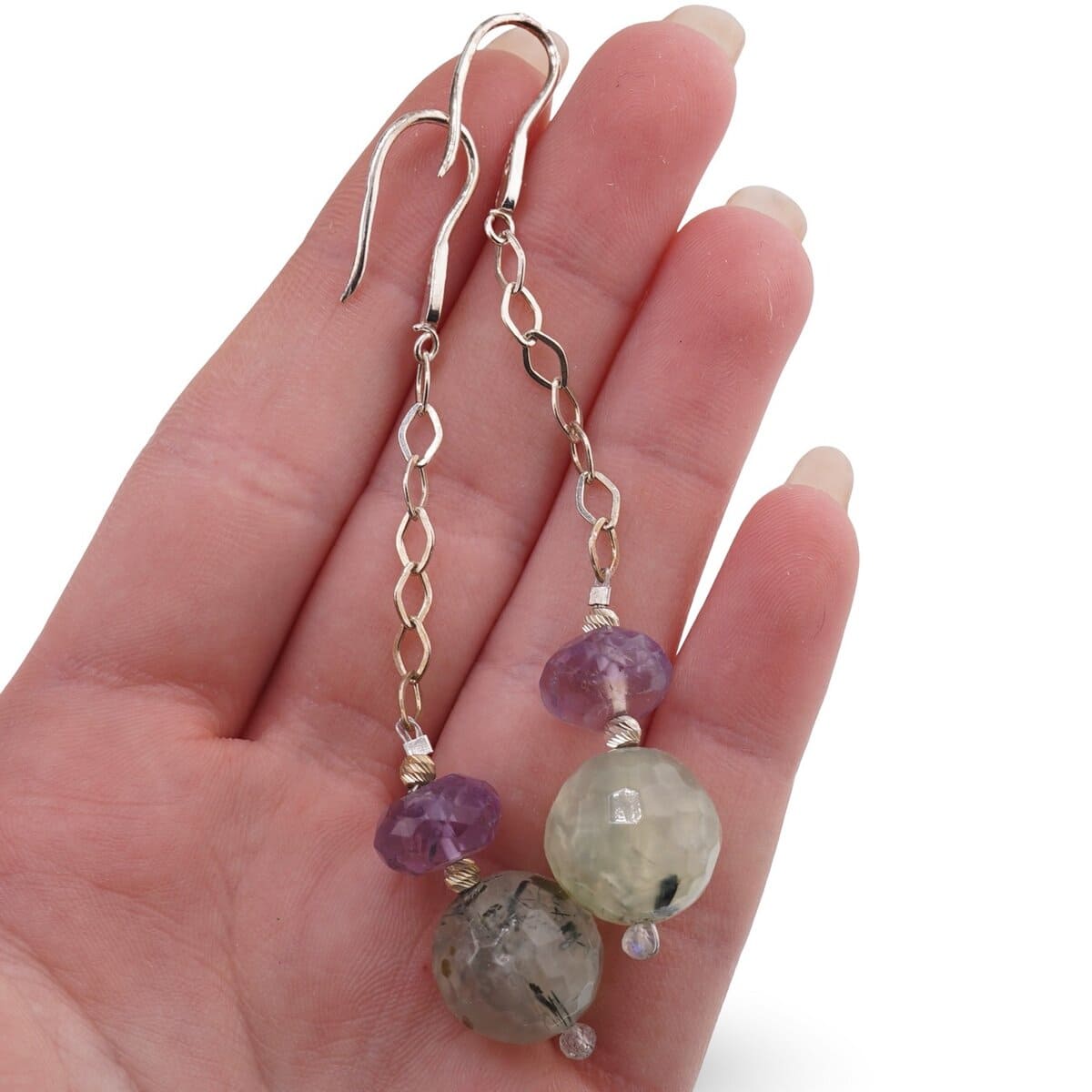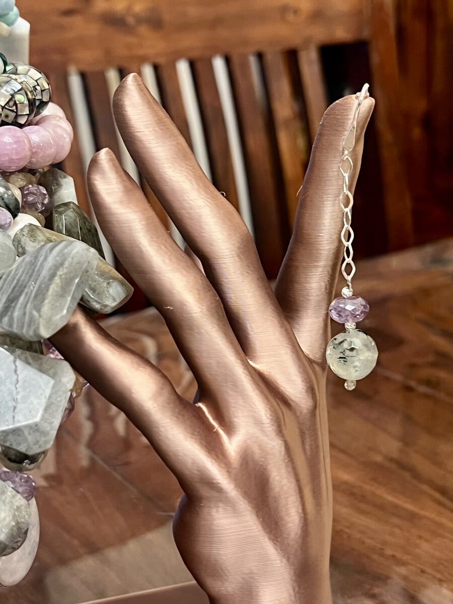Cerceii sunt lucrați cu cristale naturale 100%, cu duritate 6–6,5 pe scara Mohs, astfel încât să fie ușor de purtat în fiecare zi, fără să pară încărcați sau pretențioși. Forma de discuri fațetate pentru ametist și de sfere fațetate pentru prehnit permite luminii să se joace frumos pe suprafața pietrelor, scoțând în evidență detaliile delicate și nuanțele bogate de mov și verde.