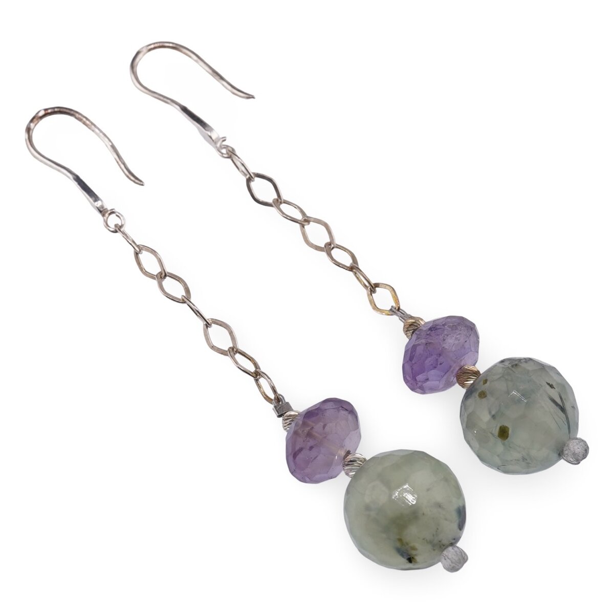 Cercei cu agatatoare Ametist discuri fatetate 10mm si Prehnit sfere fatetate 14mm cu Argint 925