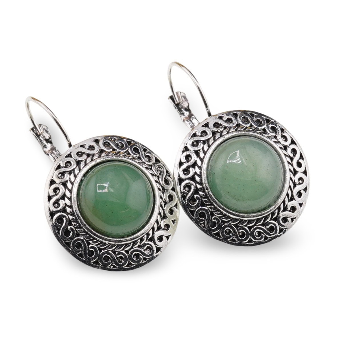 Cercei cu agatatoare Aventurin in montura argintie - model rotund cu gravura infinit , 24mm.