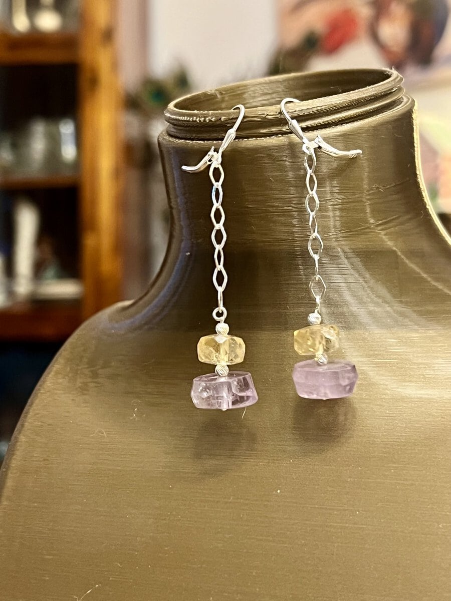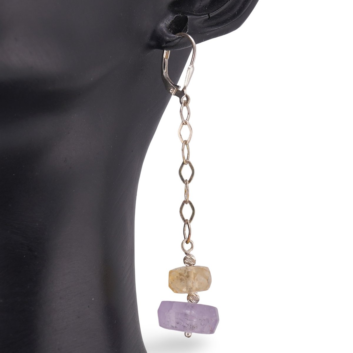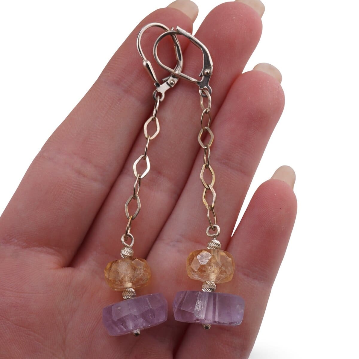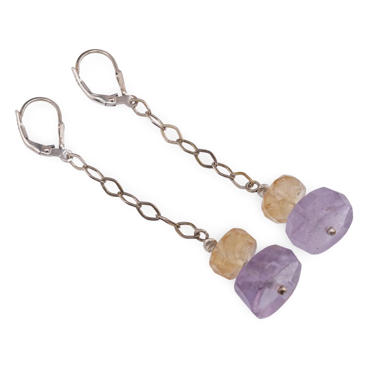 Cerceii cu agățatoare din citrin și ametist, realizați din discuri fațetate de 10–15 mm și montați în argint 925, sunt o alegere inspirată pentru tine dacă îți dorești o bijuterie elegantă, care să îmbine frumusețea cristalelor naturale cu echilibrul interior. Contrastul dintre galbenul cald al citrinului și nuanțele de mov ale ametistului creează un joc plăcut de culori, potrivit atât pentru ținutele de zi, cât și pentru cele de seară.